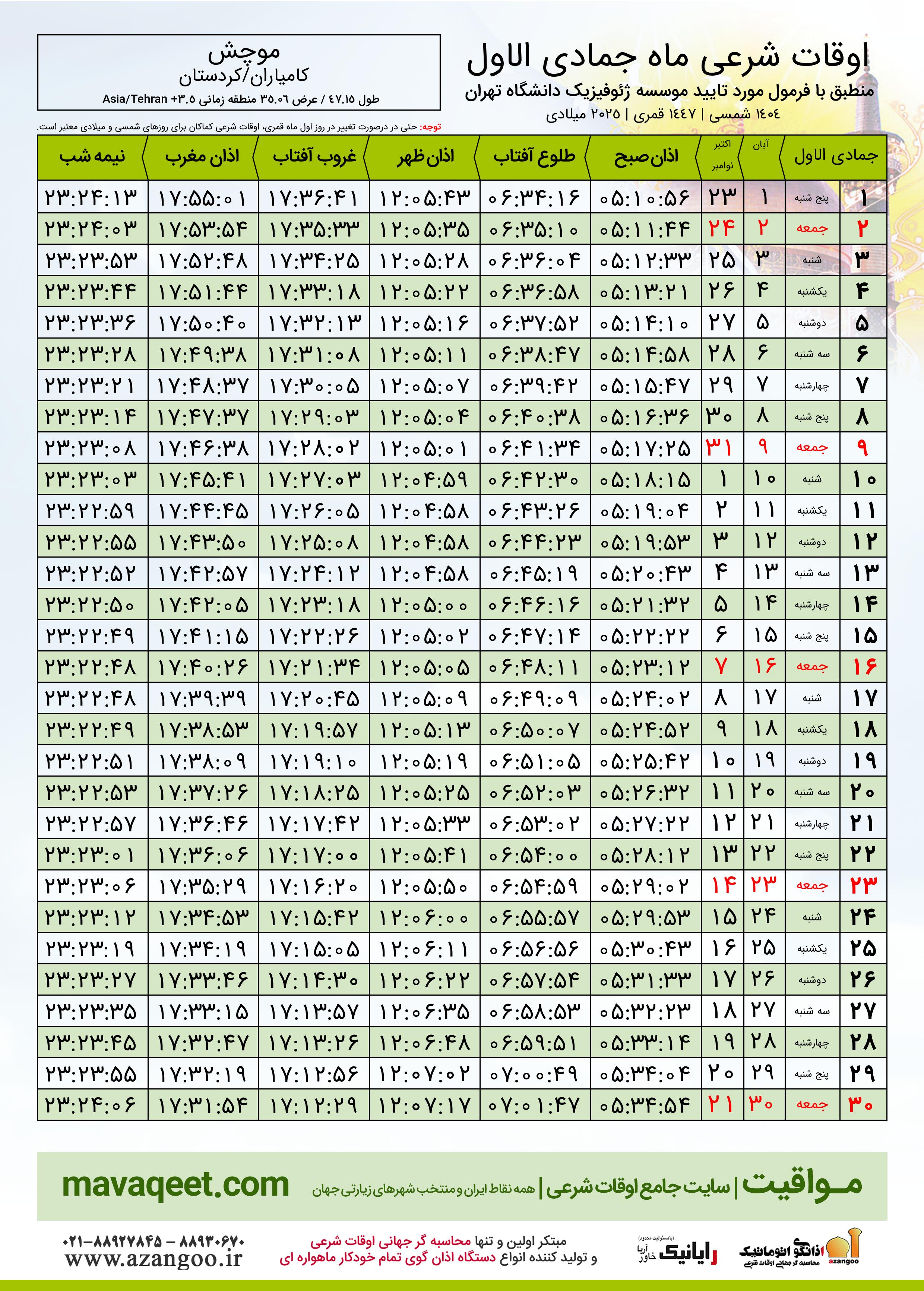 اوقات شرعی ماه جمادی الاول ١٤٤٧ هـ.ق شهر موچش بر