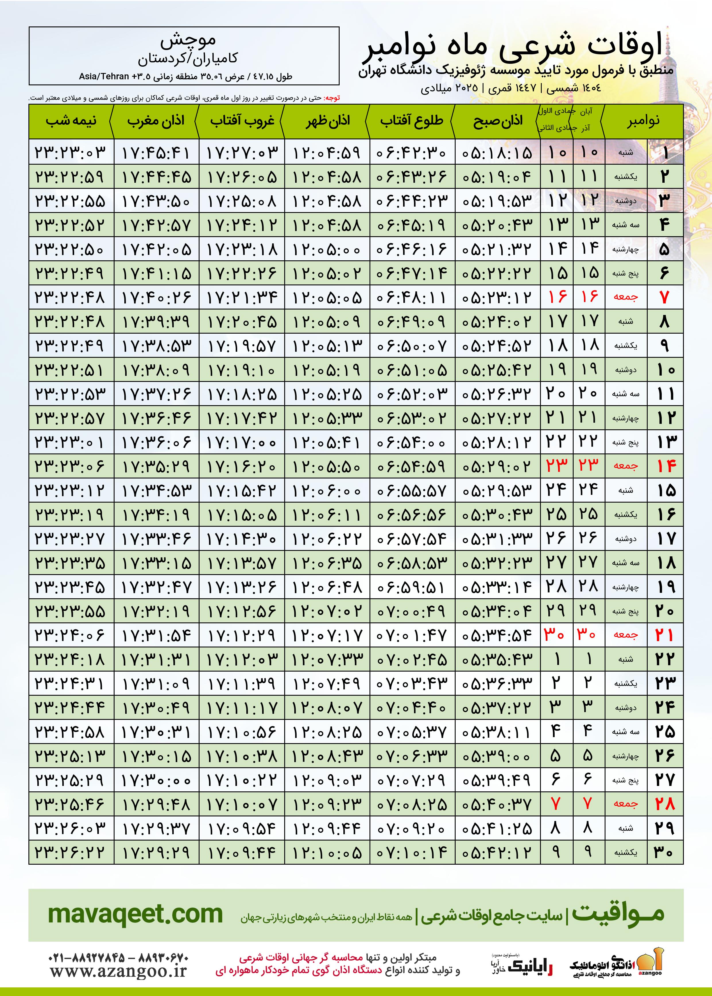 جدول اوقات شرعی نوامبر ٢٠٢٥ میلادی شهر موچش