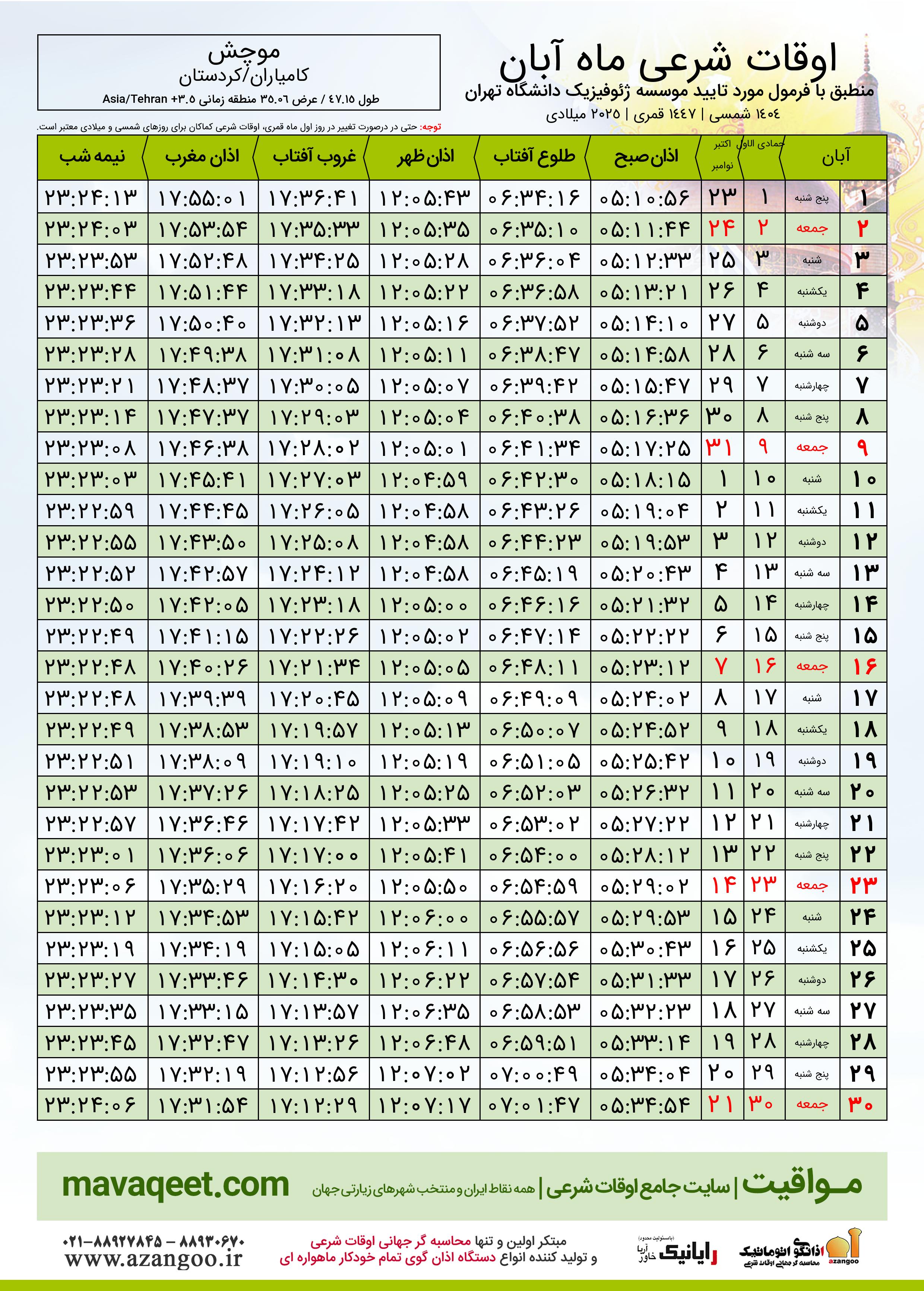 جدول اوقات شرعی آبان ١٤٠٤ شمسی شهر موچش