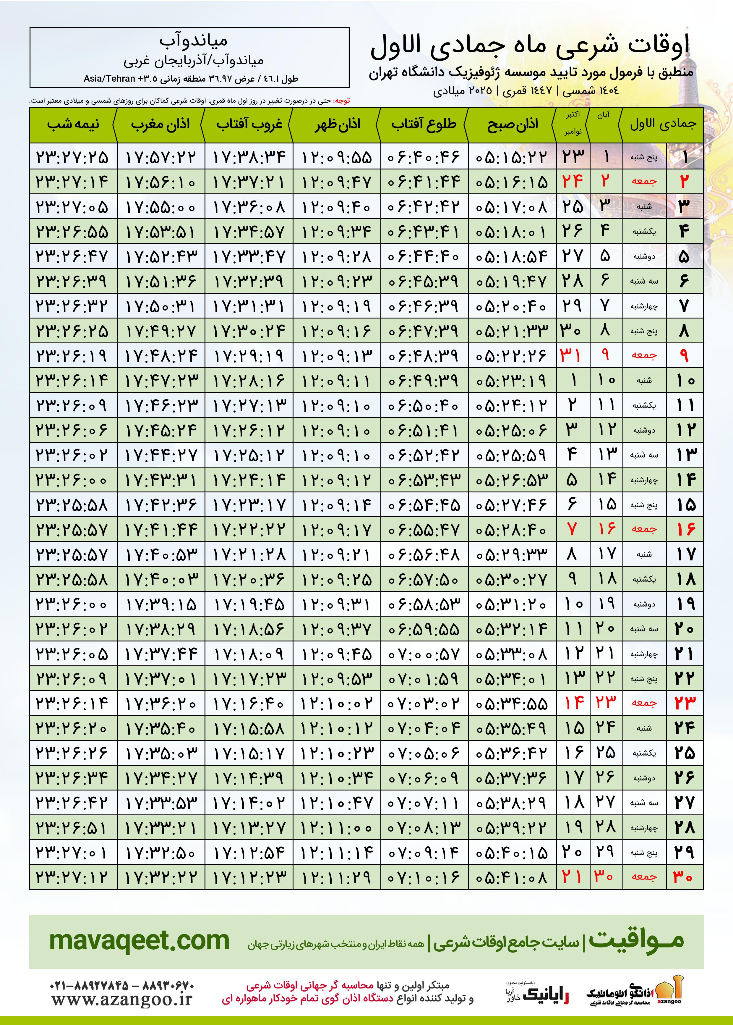 جدول اوقات شرعی جمادی الاول ١٤٤٧ قمری شهر میاندوآب
