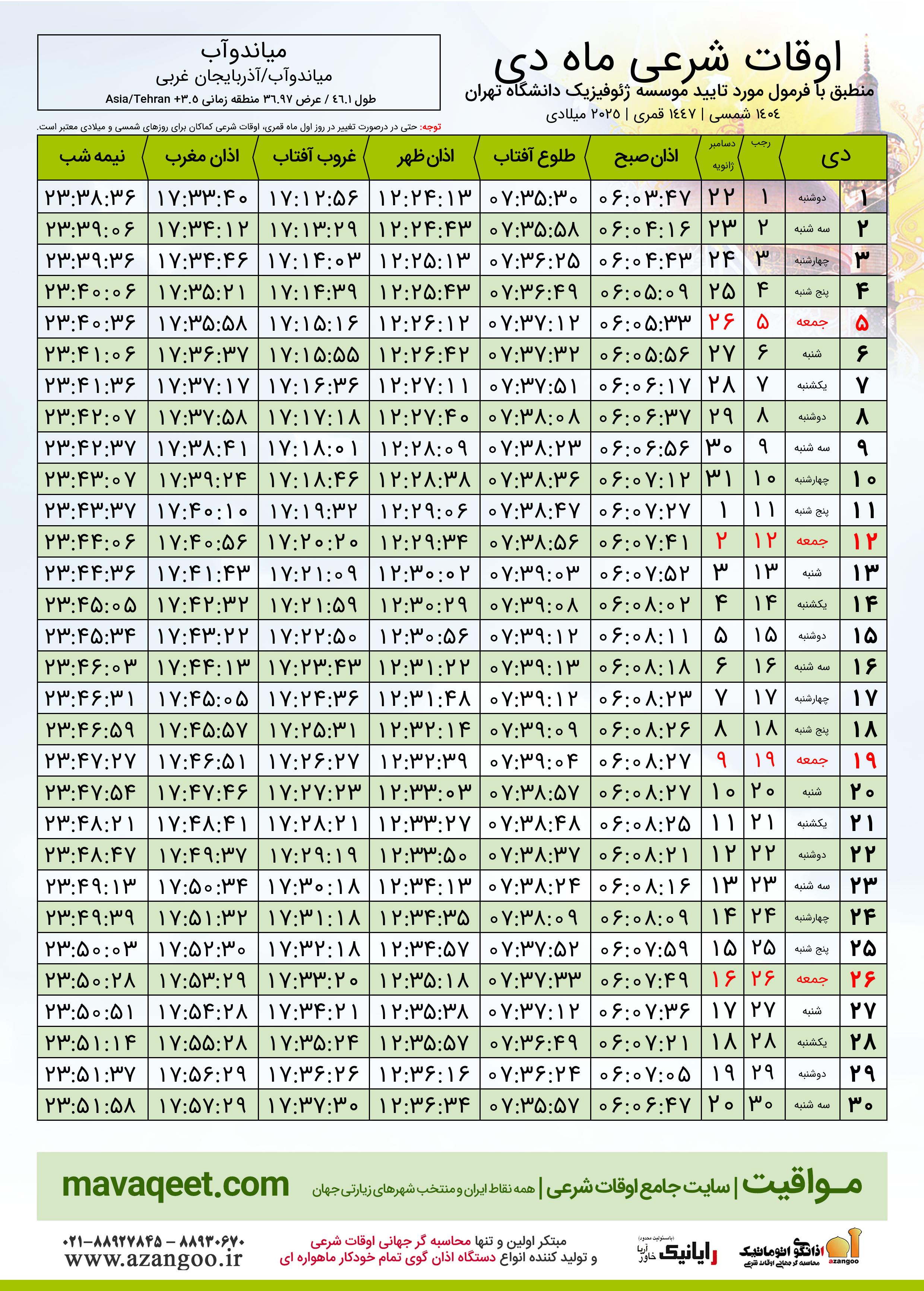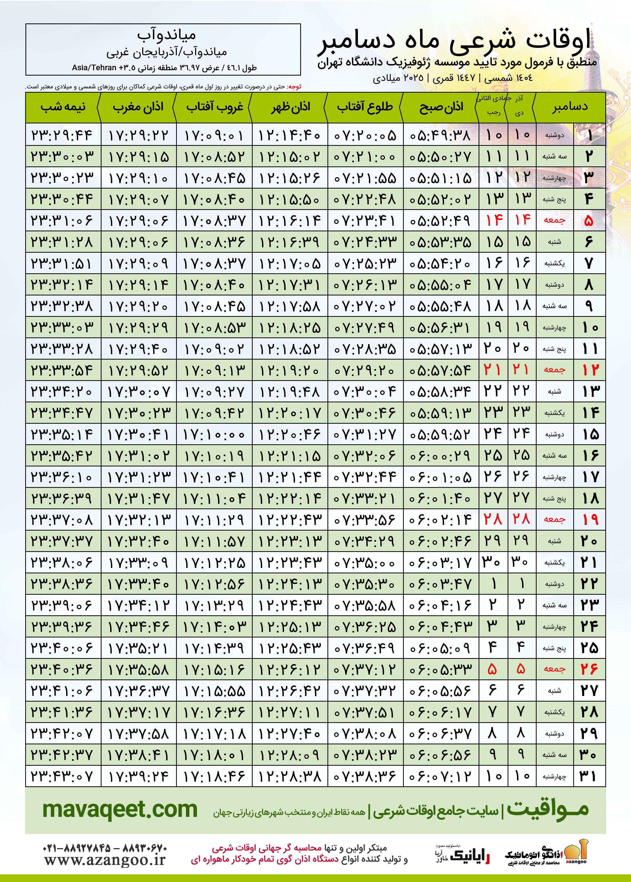 جدول اوقات شرعی دسامبر ٢٠٢٥ میلادی شهر میاندوآب