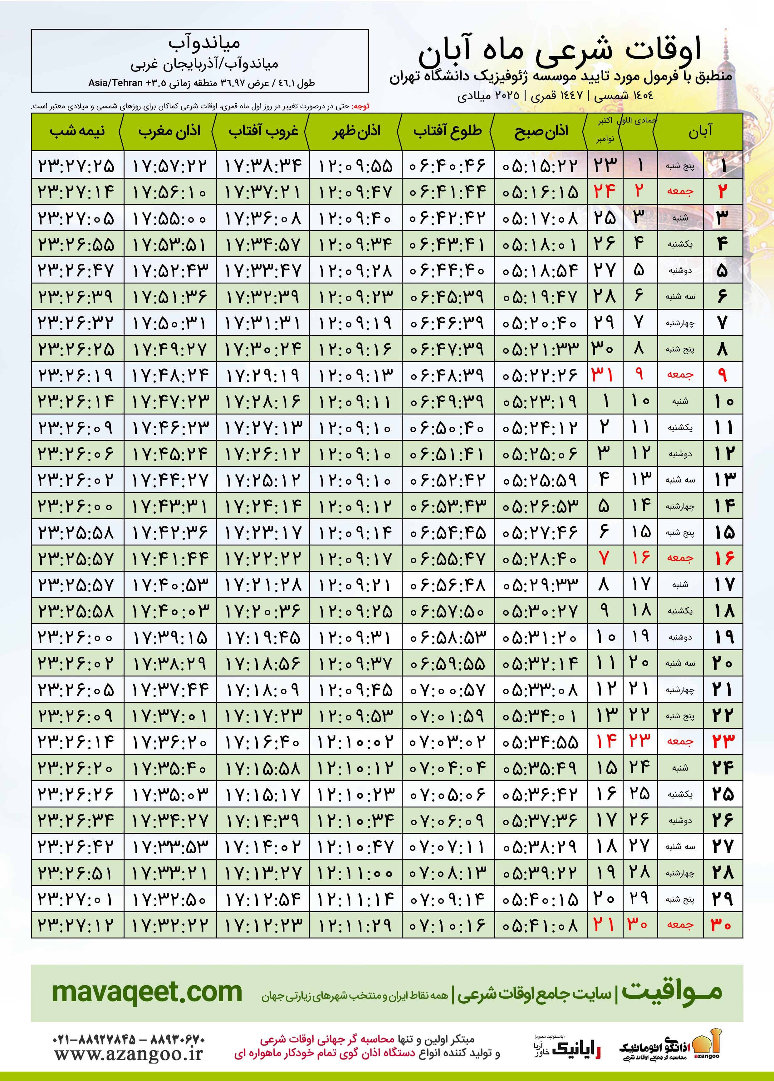 جدول اوقات شرعی آبان ١٤٠٤ شمسی شهر میاندوآب