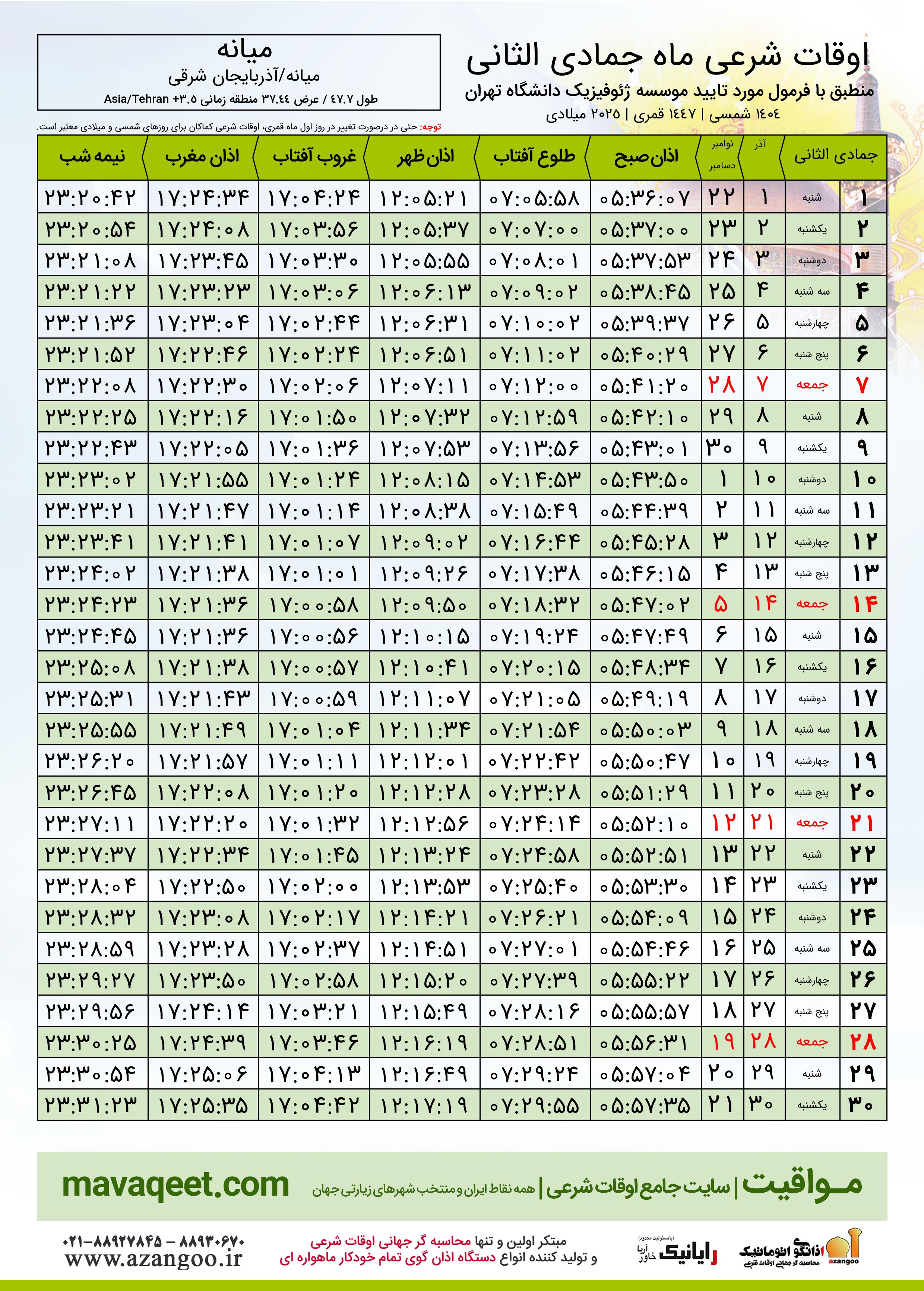 اوقات شرعی ماه جمادی الثانی ١٤٤٧ هـ.ق شهر میانه بر