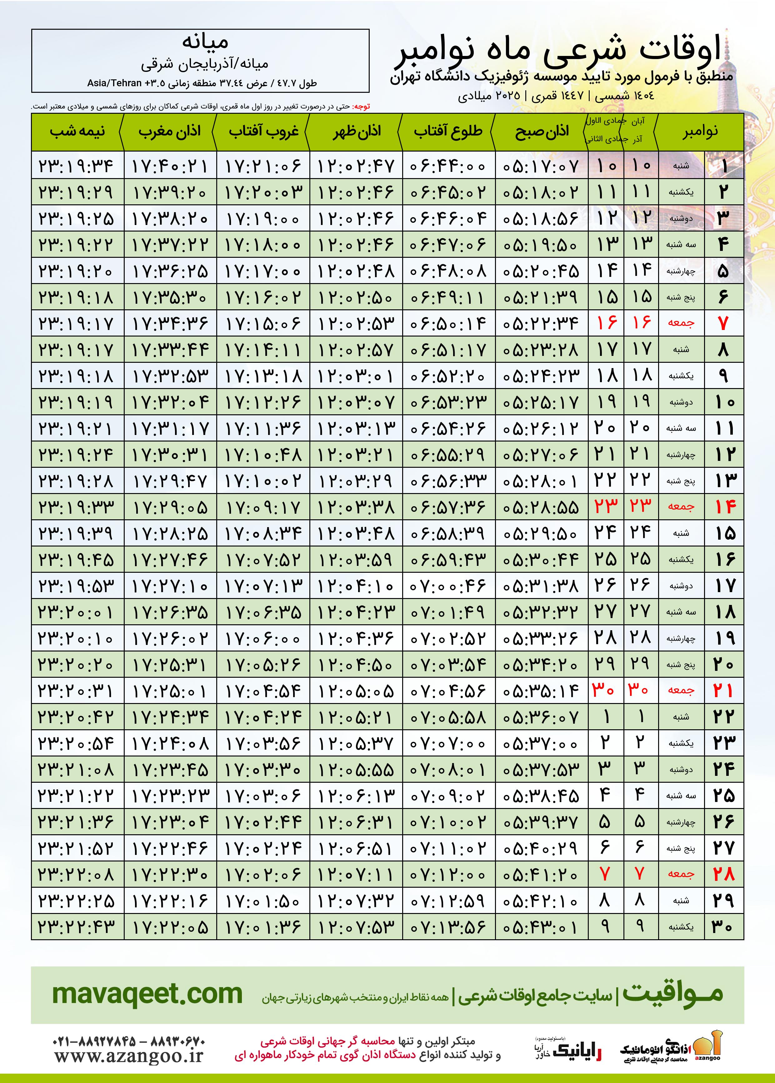 جدول اوقات شرعی نوامبر ٢٠٢٥ میلادی شهر میانه