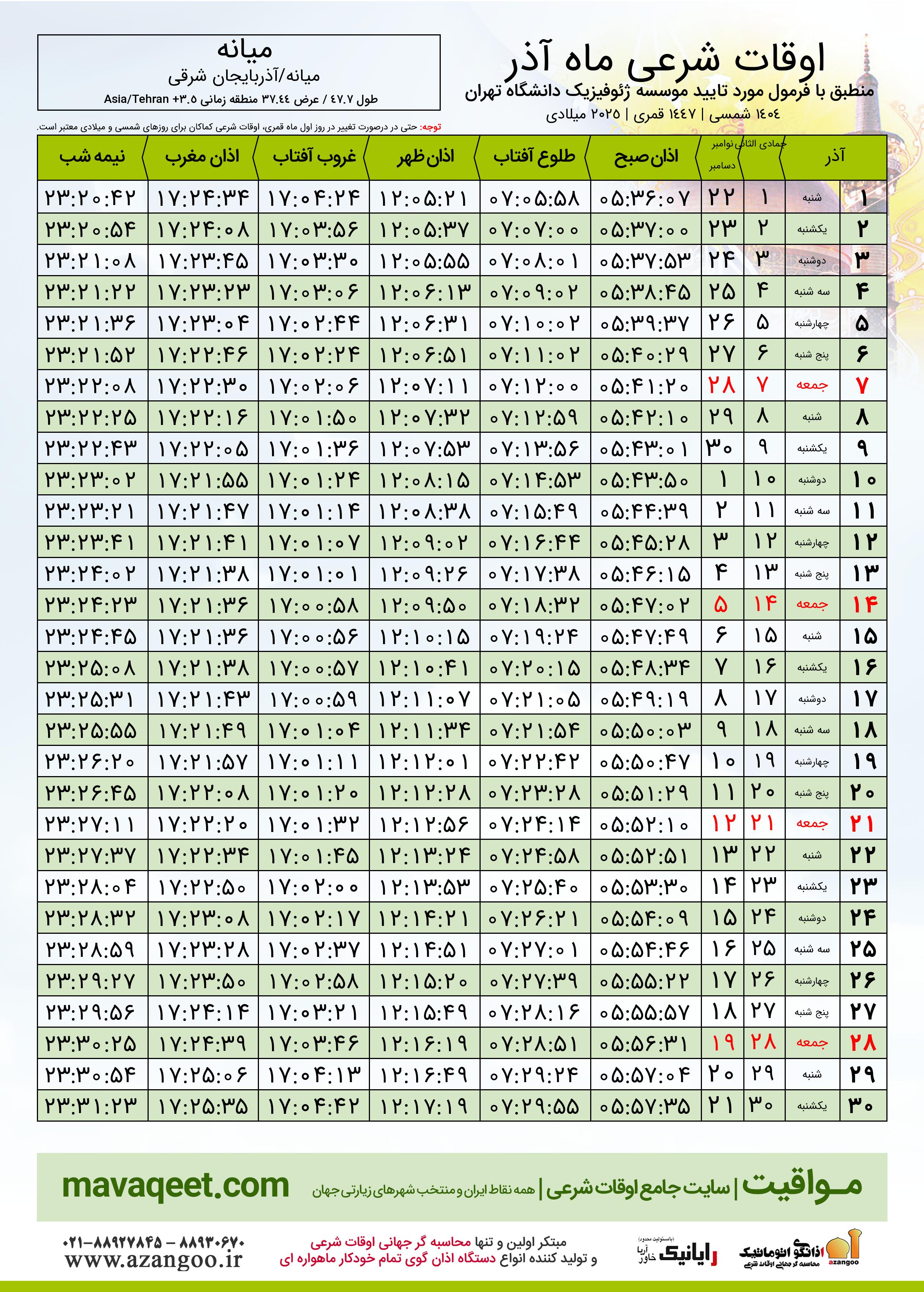 اوقات شرعی آذر ١٤٠٤ شمسی شهر میانه