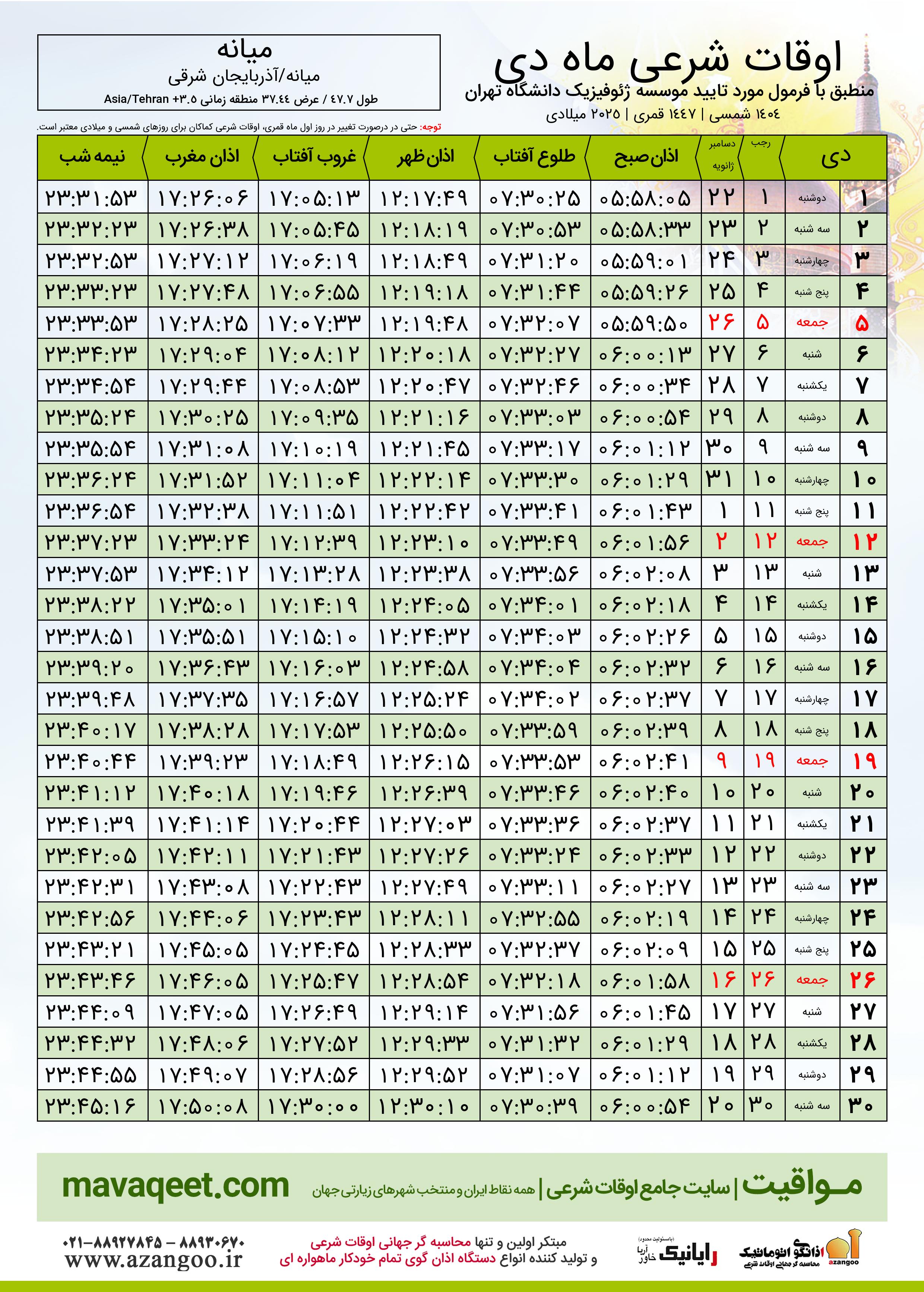 اوقات شرعی دی ١٤٠٤ شمسی شهر میانه