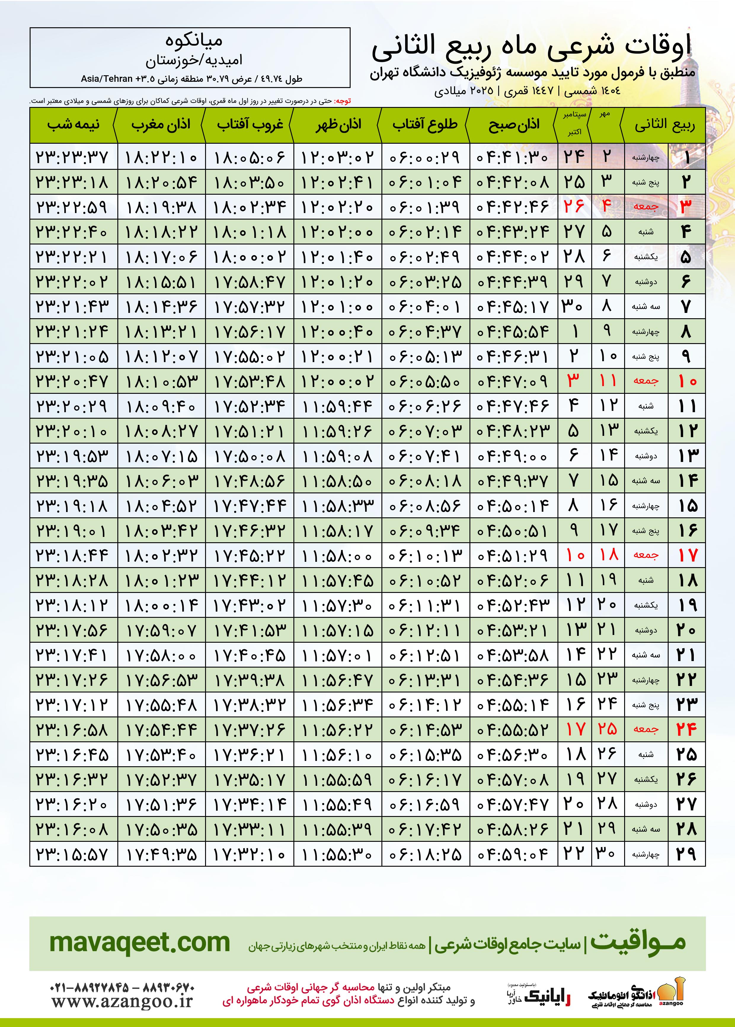 اوقات شرعی ماه ربیع الثانی ١٤٤٧ هـ.ق شهر میانکوه بر