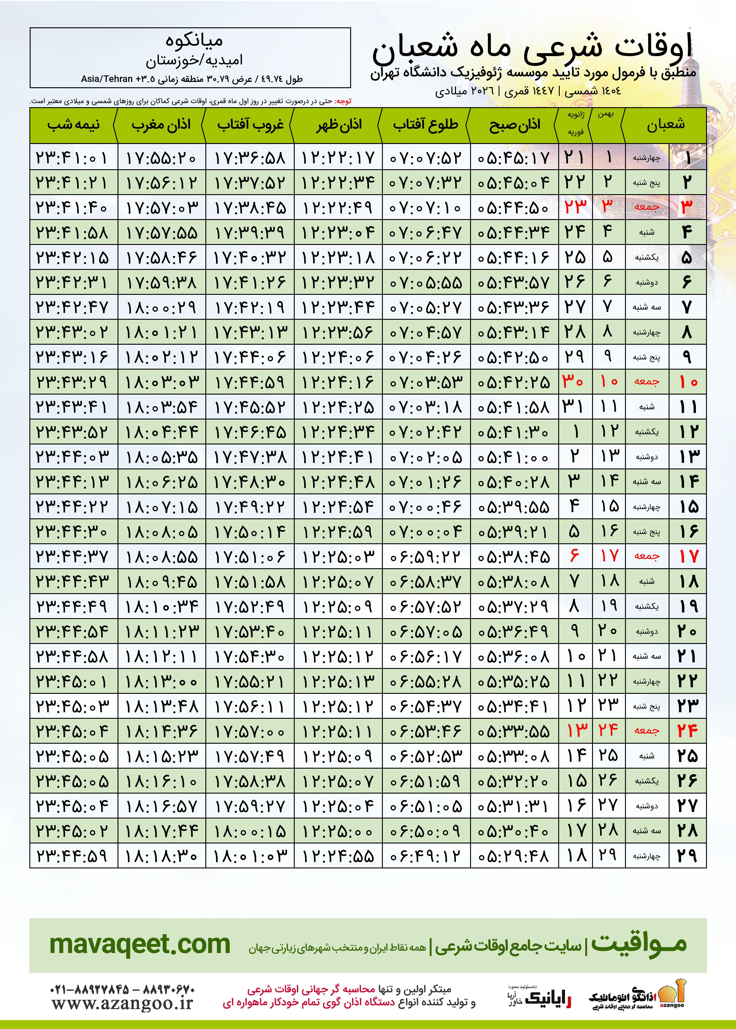 جدول اوقات شرعی شعبان ١٤٤٧ قمری شهر میانکوه