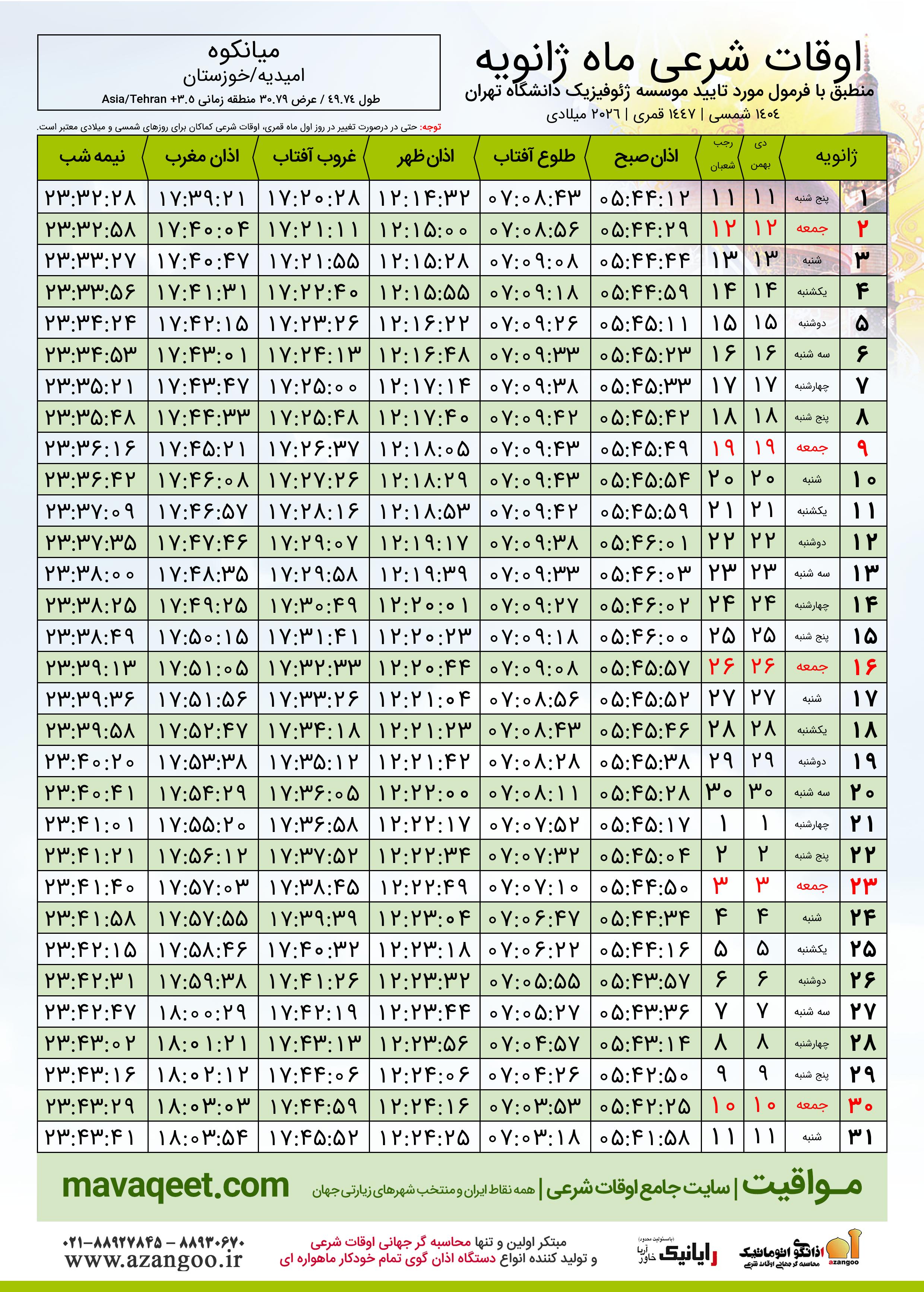 اوقات شرعی ژانویه ٢٠٢٦ شهر میانکوه + دانلود