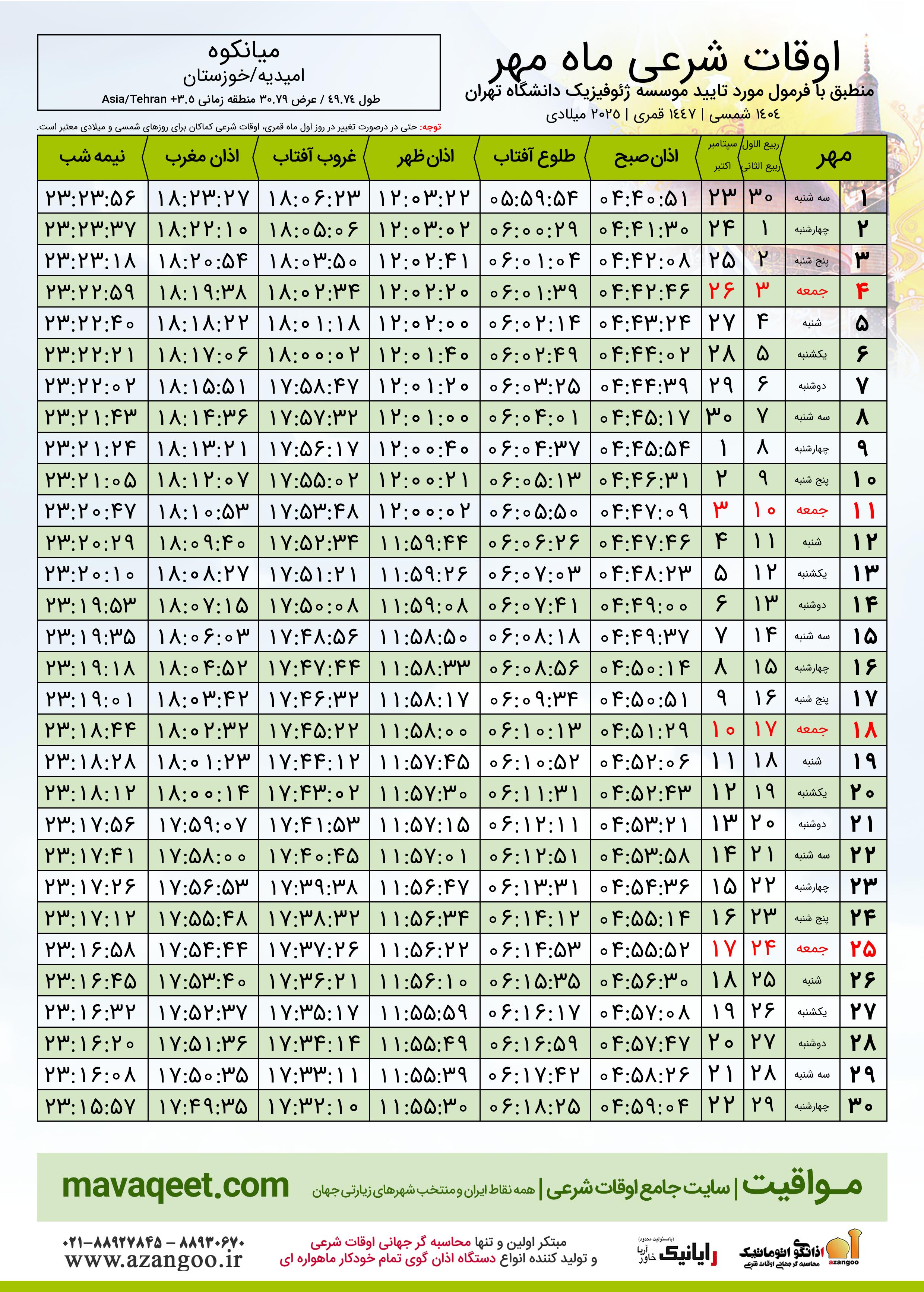 جدول اوقات شرعی مهر ١٤٠٤ شمسی شهر میانکوه