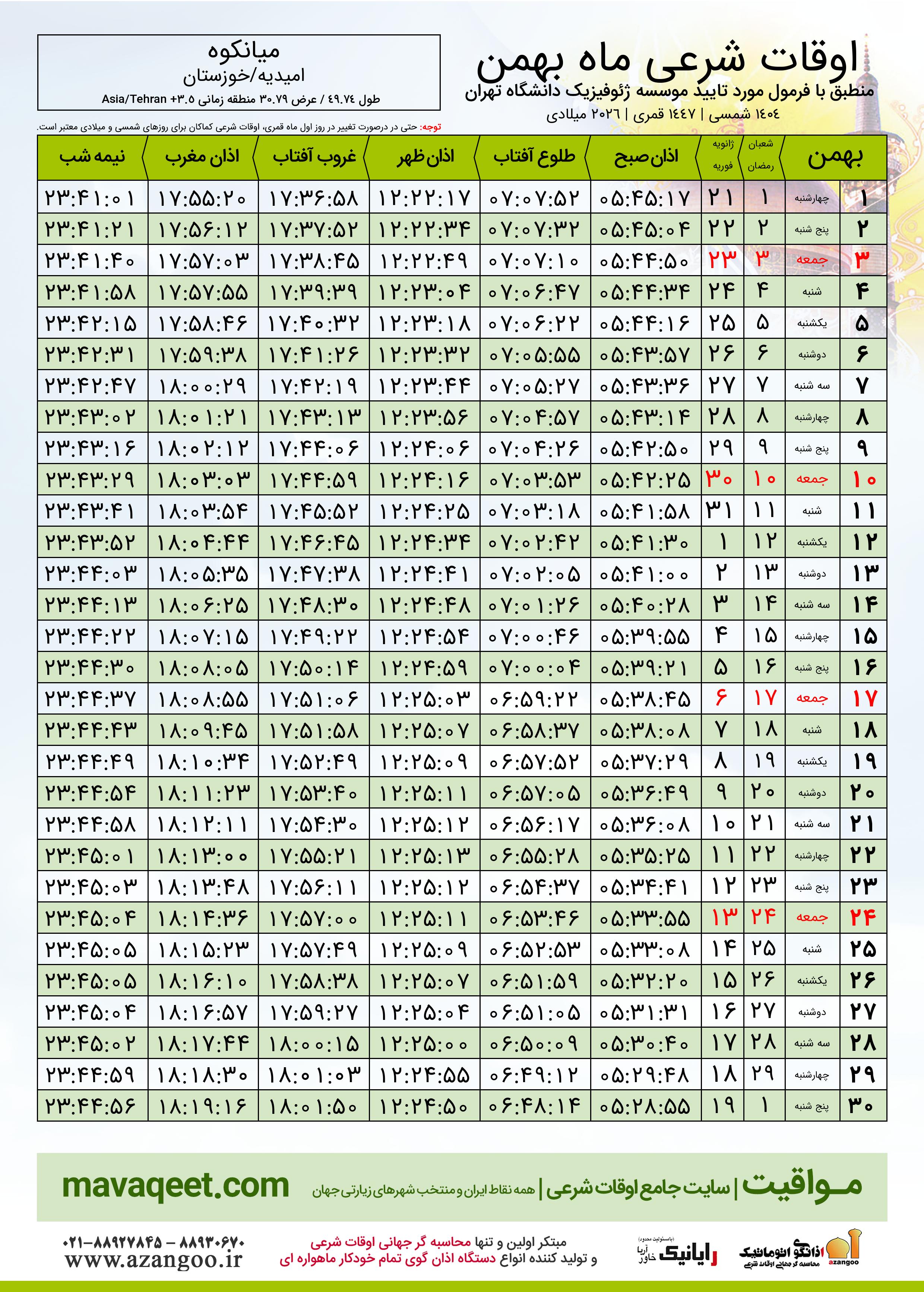 دانلود اوقات شرعی بهمن ٠٤ - ١٤٠٤ شهر میانکوه