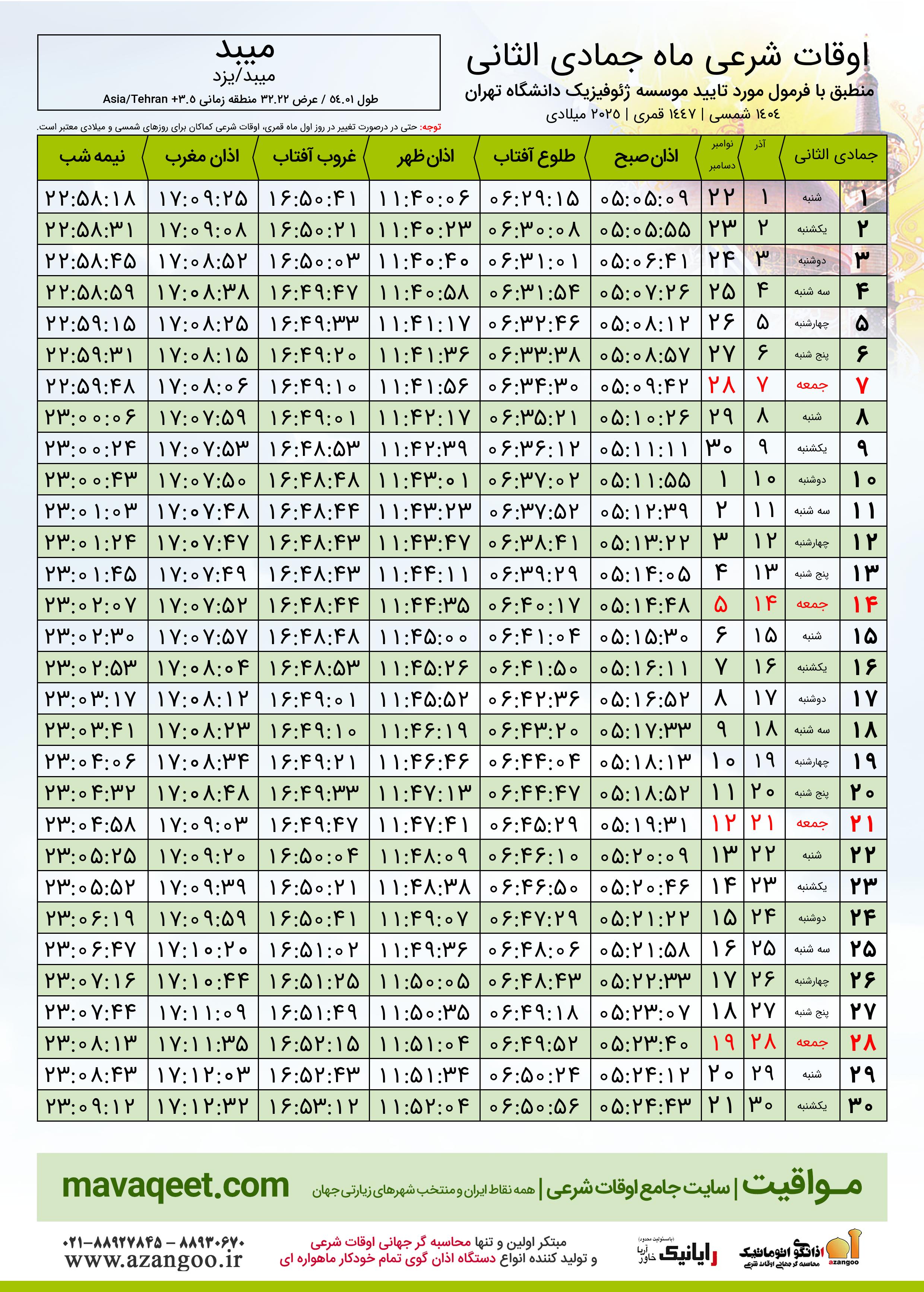 اوقات شرعی ماه جمادی الثانی ١٤٤٧ هـ.ق شهر میبد بر