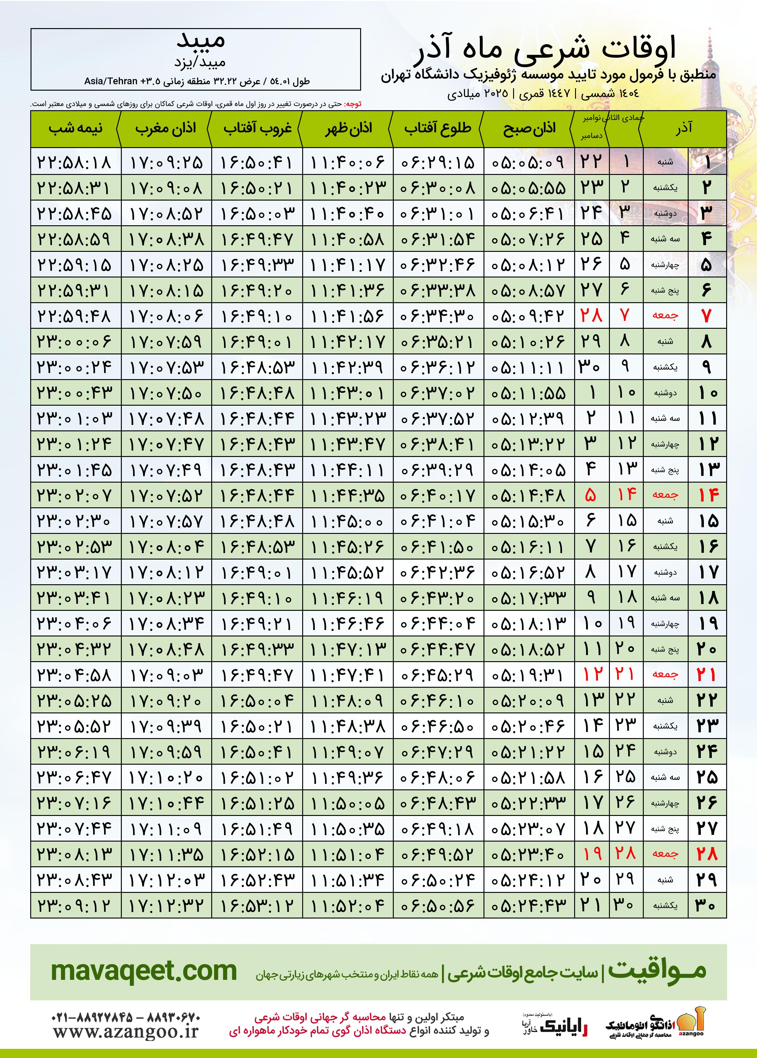 جدول اوقات شرعی آذر ١٤٠٤ شمسی شهر میبد