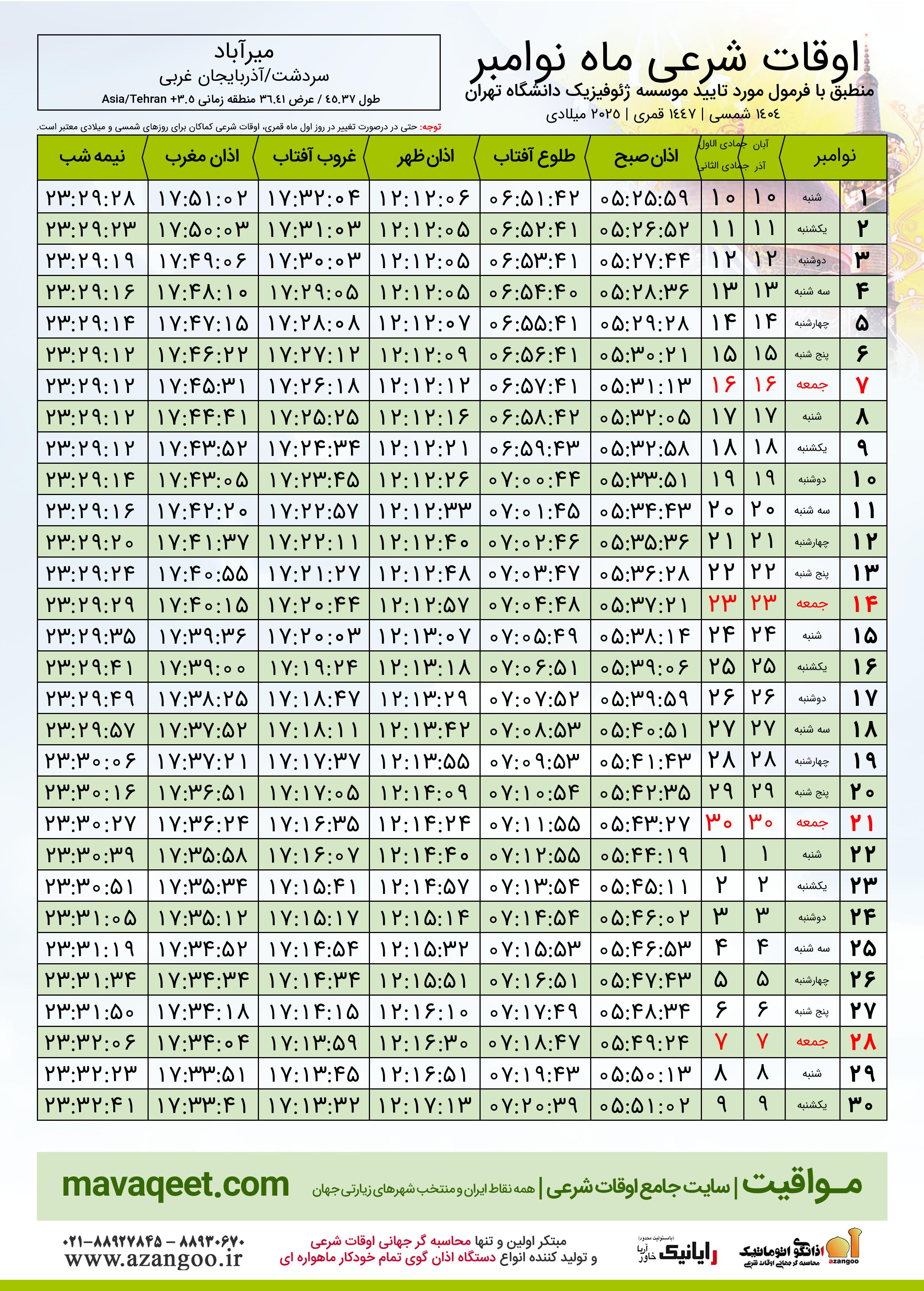 دانلود اوقات شرعی نوامبر ٢٠٢٥ شهر میرآباد