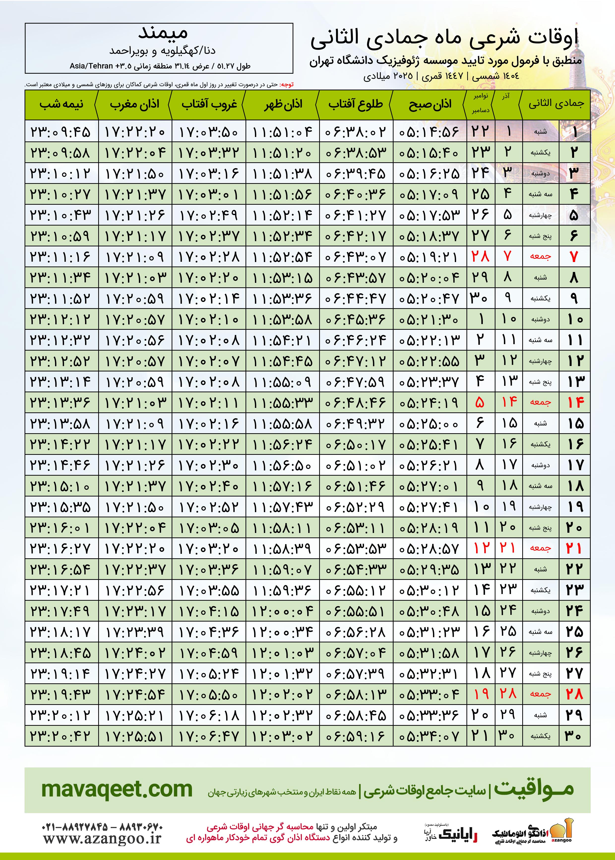 اوقات شرعی ماه جمادی الثانی ١٤٤٧ هـ.ق شهر میمند بر