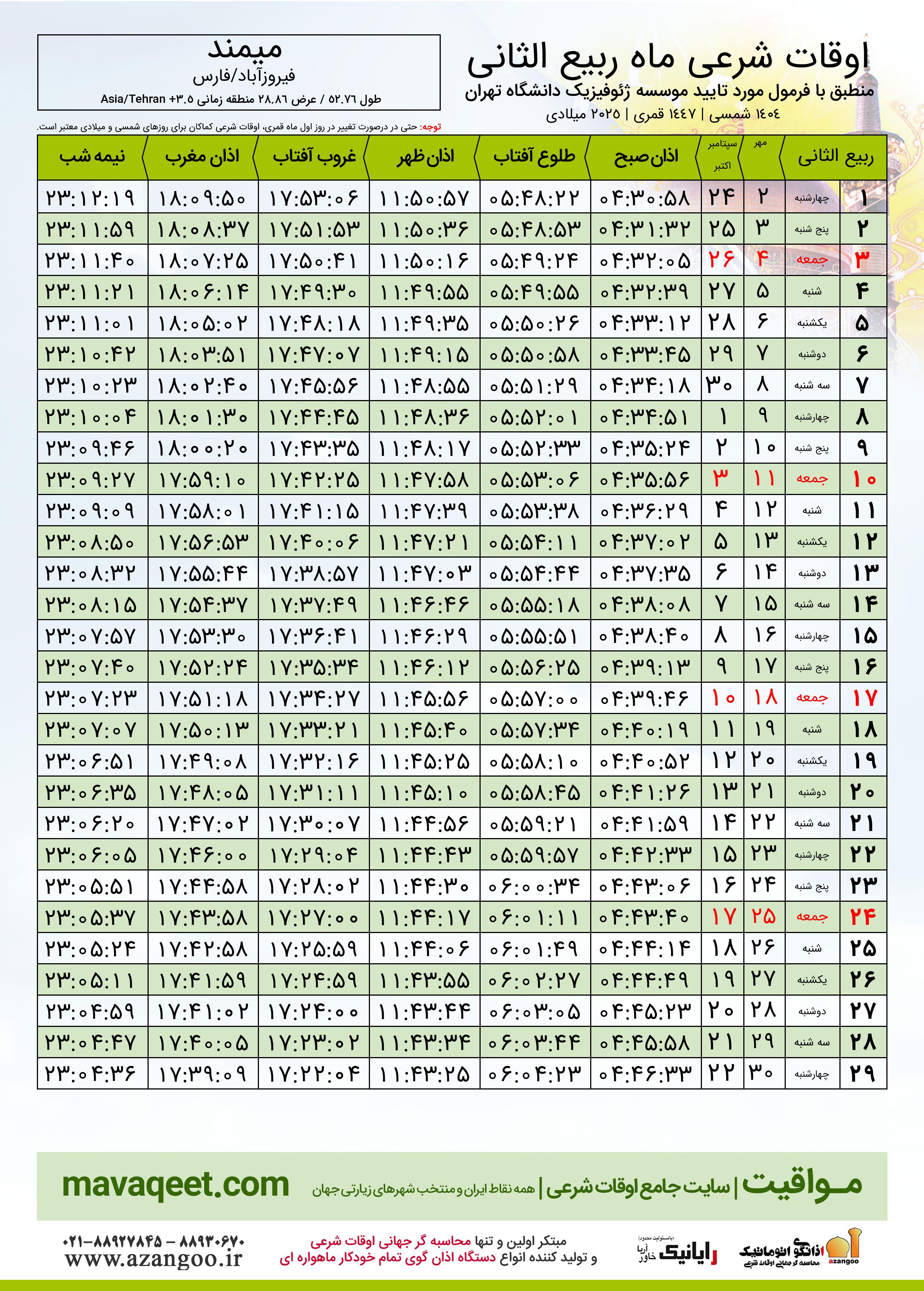 جهت نمایش تصویر جدول اوقات شرعی ماه ربیع الثانی ١٤٤٧ هـ.ق شهر میمند در اندازه
