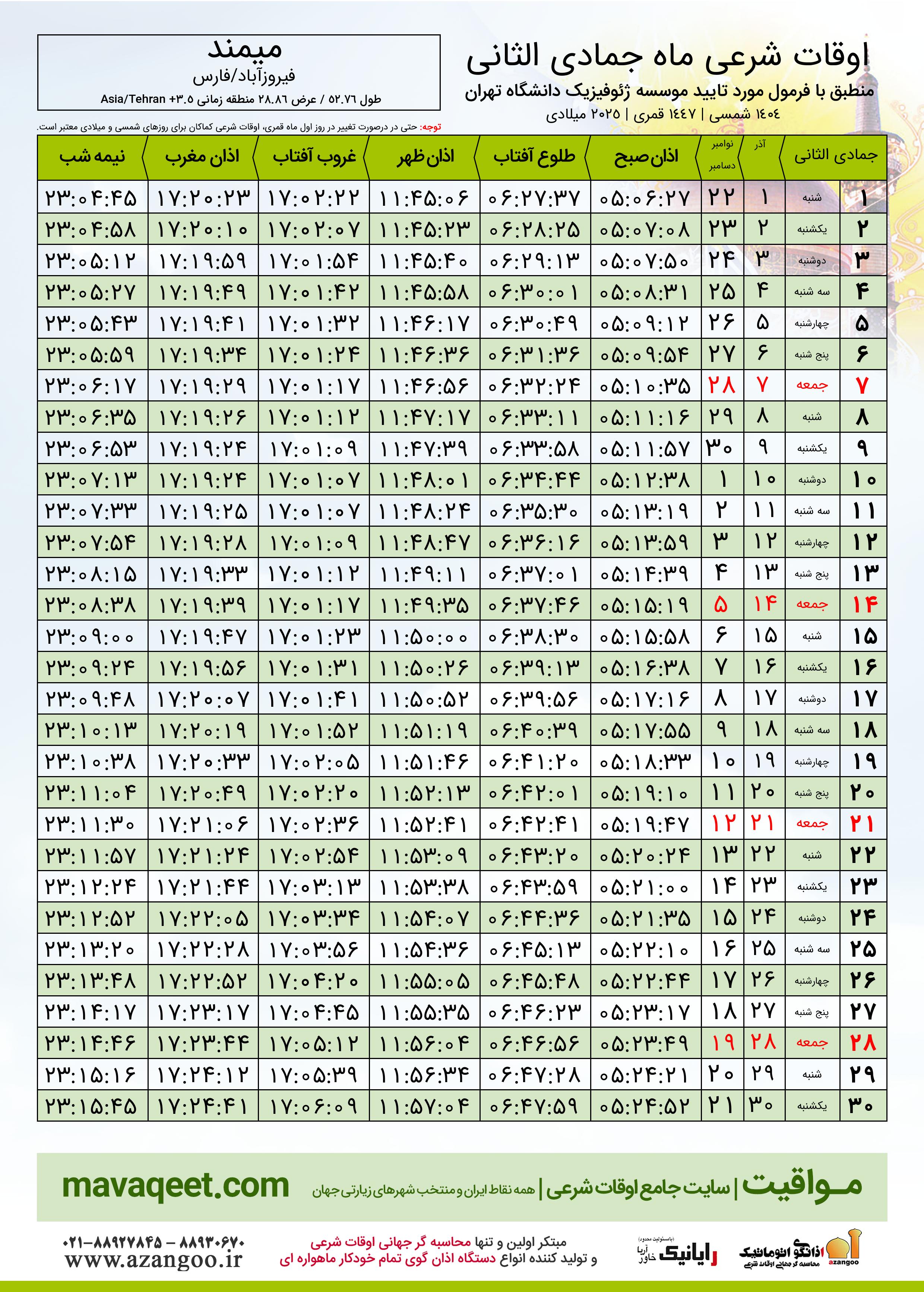 اوقات شرعی ماه جمادی الثانی ١٤٤٧ هـ.ق شهر میمند بر