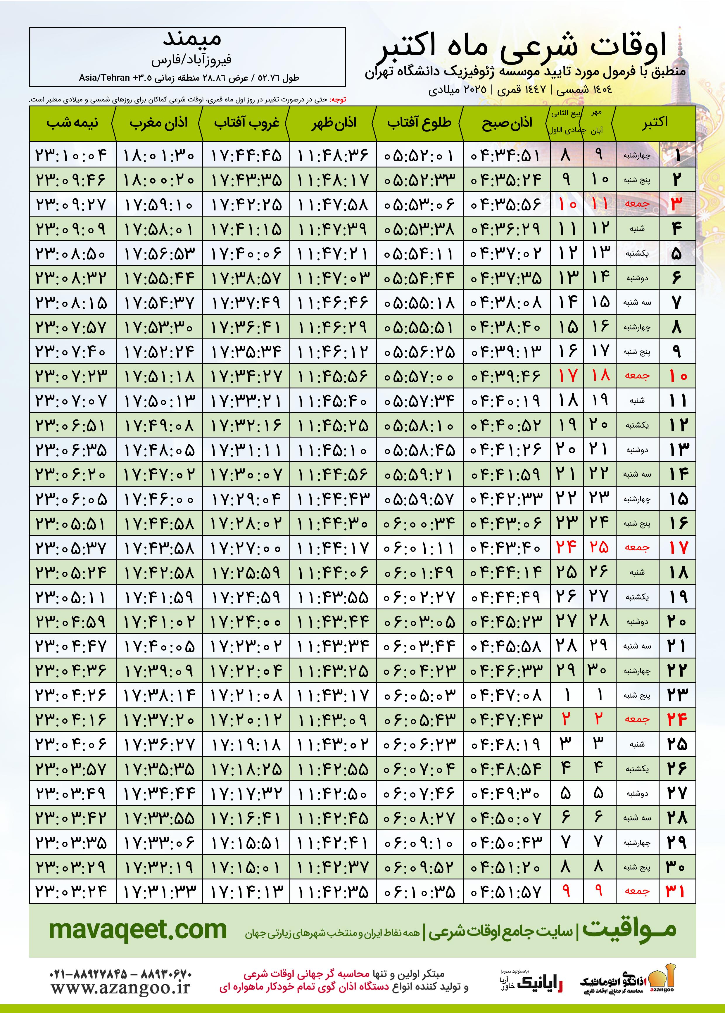 جدول اوقات شرعی اکتبر ٢٠٢٥ میلادی شهر میمند