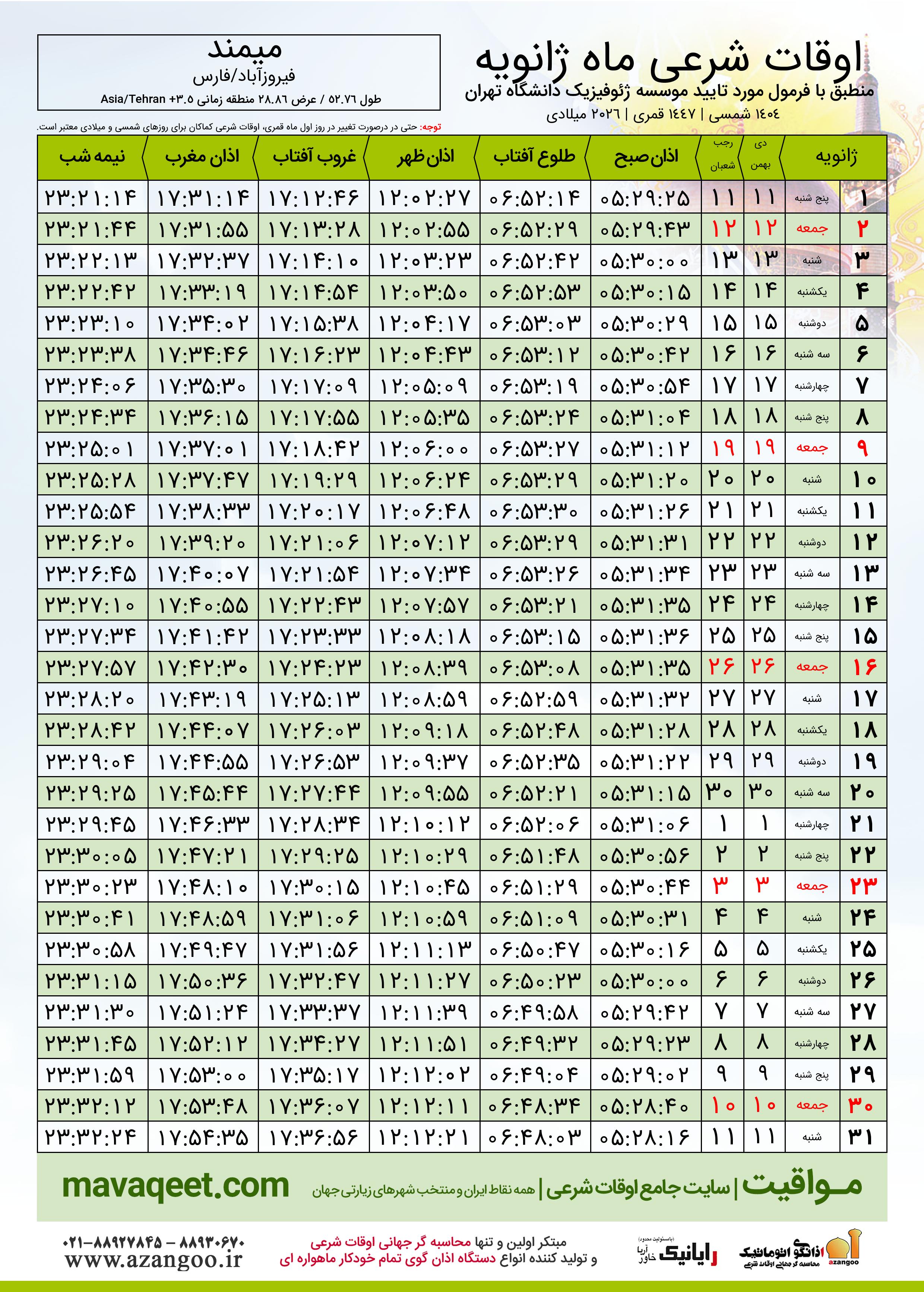 دانلود اوقات شرعی ماه رمضان ٠٤ - ١٤٠٤ شمسی | ٢٠٢٦ میلادی | ١٤٤٧ قمری شهر میمند