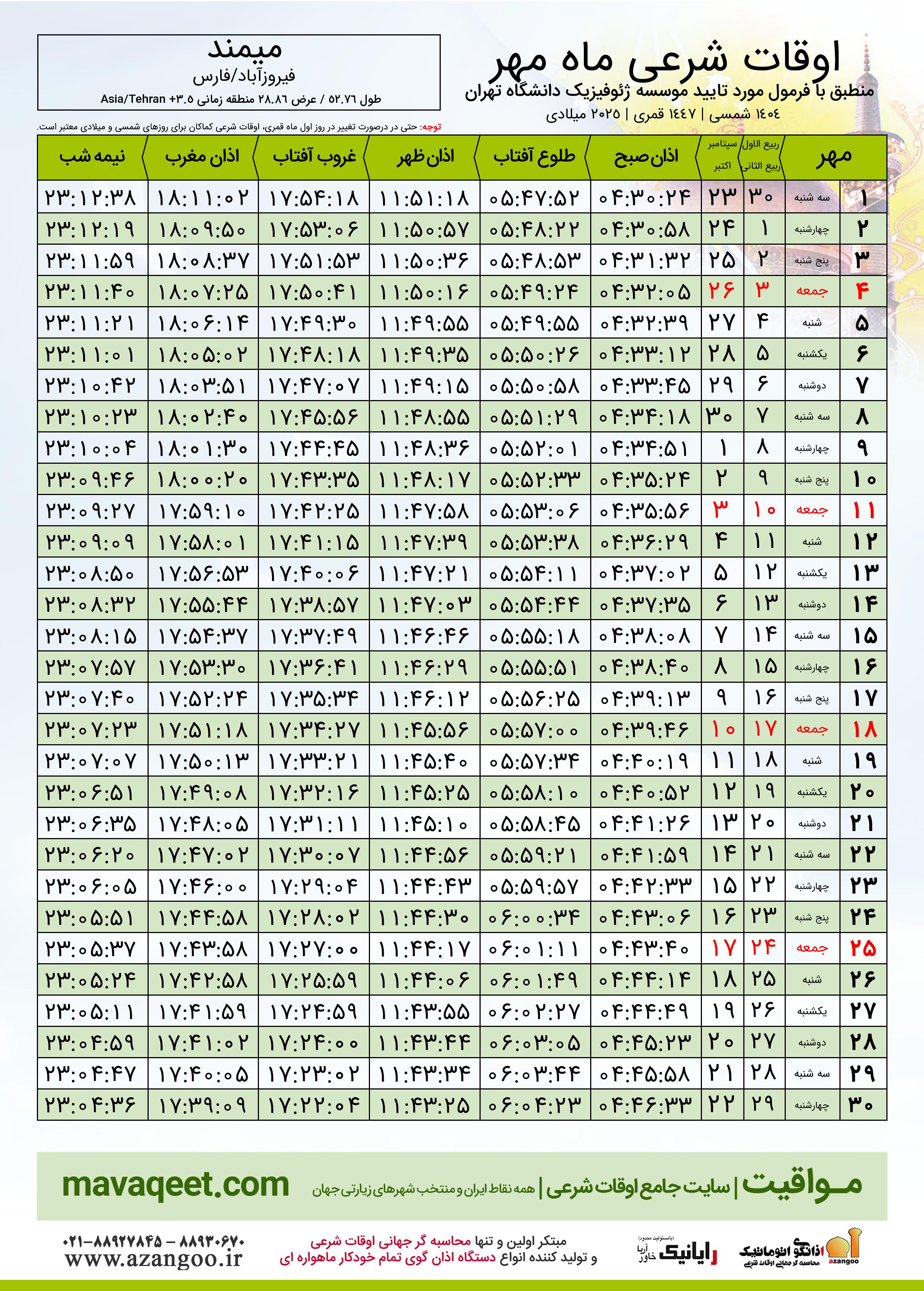دانلود اوقات شرعی مهر ٠٤ - ١٤٠٤ شهر میمند