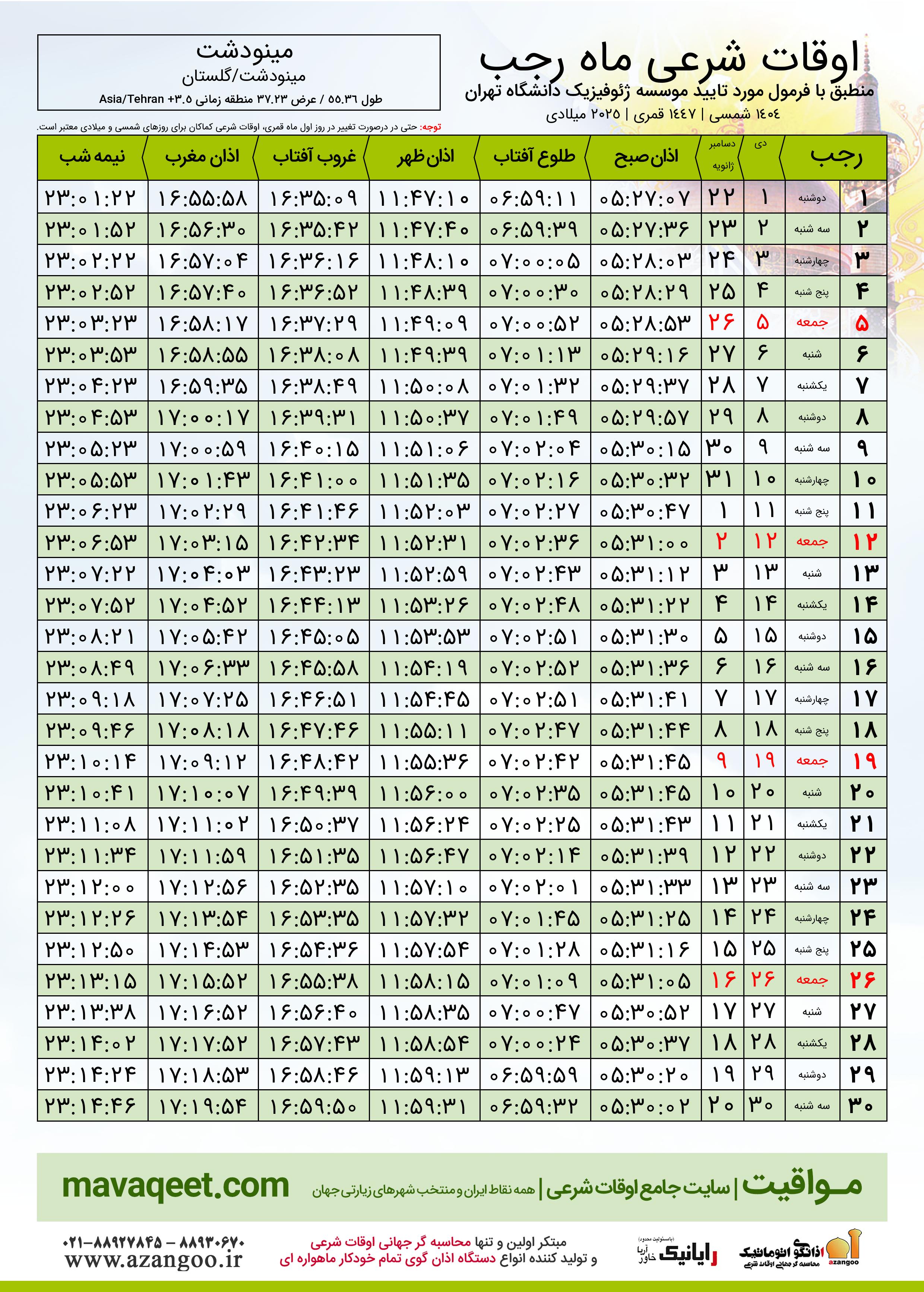 اوقات شرعی ماه رجب ١٤٤٧ هـ.ق شهر مینودشت بر