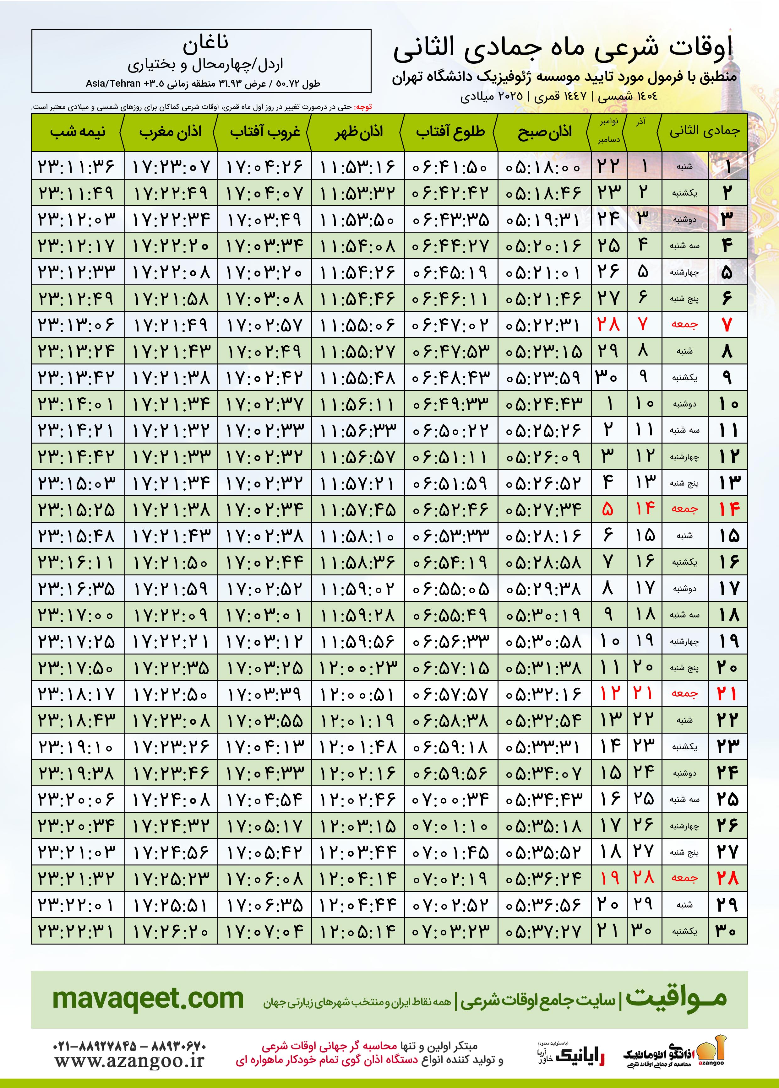 اوقات شرعی ماه جمادی الثانی ١٤٤٧ هـ.ق شهر ناغان بر