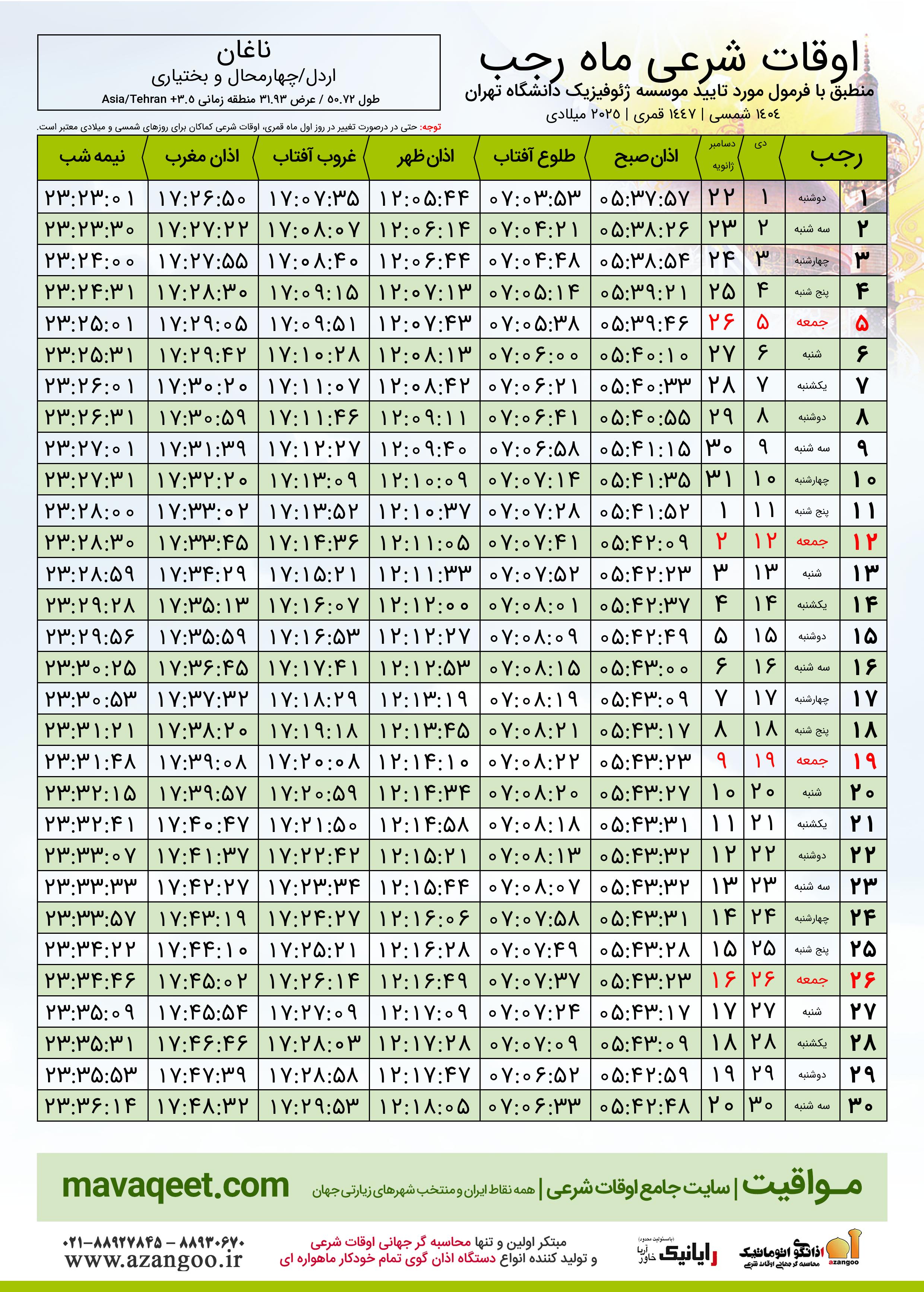 جدول اوقات شرعی رجب ١٤٤٧ قمری شهر ناغان