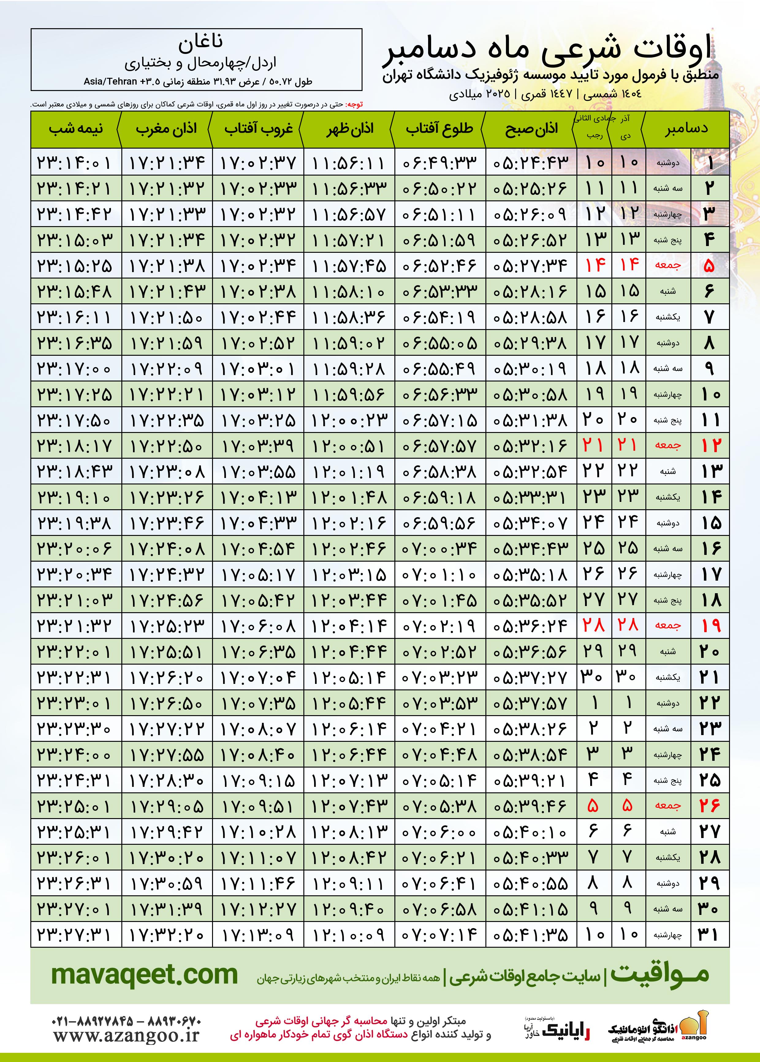جدول اوقات شرعی دسامبر ٢٠٢٥ میلادی شهر ناغان