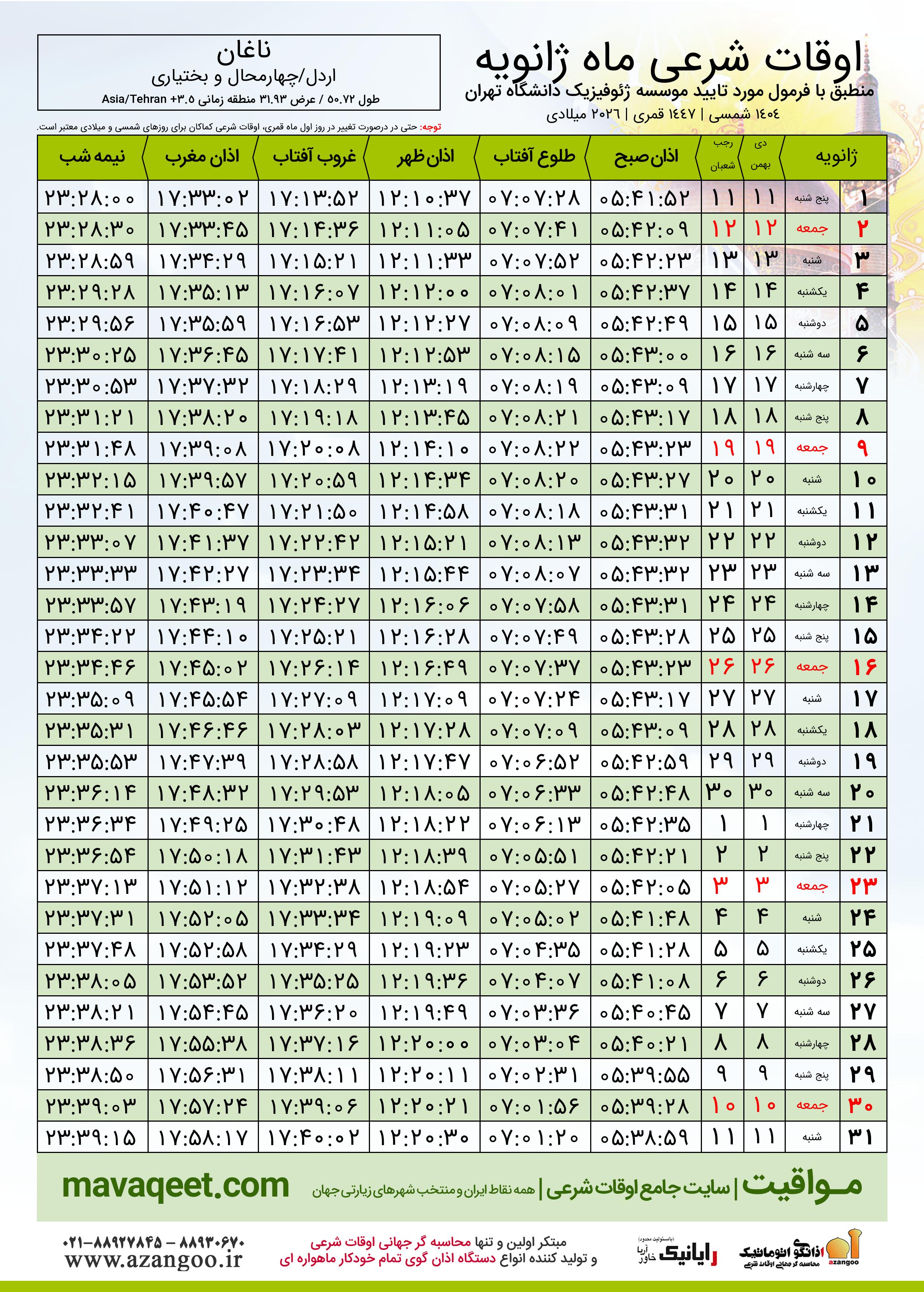 اوقات شرعی ژانویه ٢٠٢٦ میلادی شهر ناغان