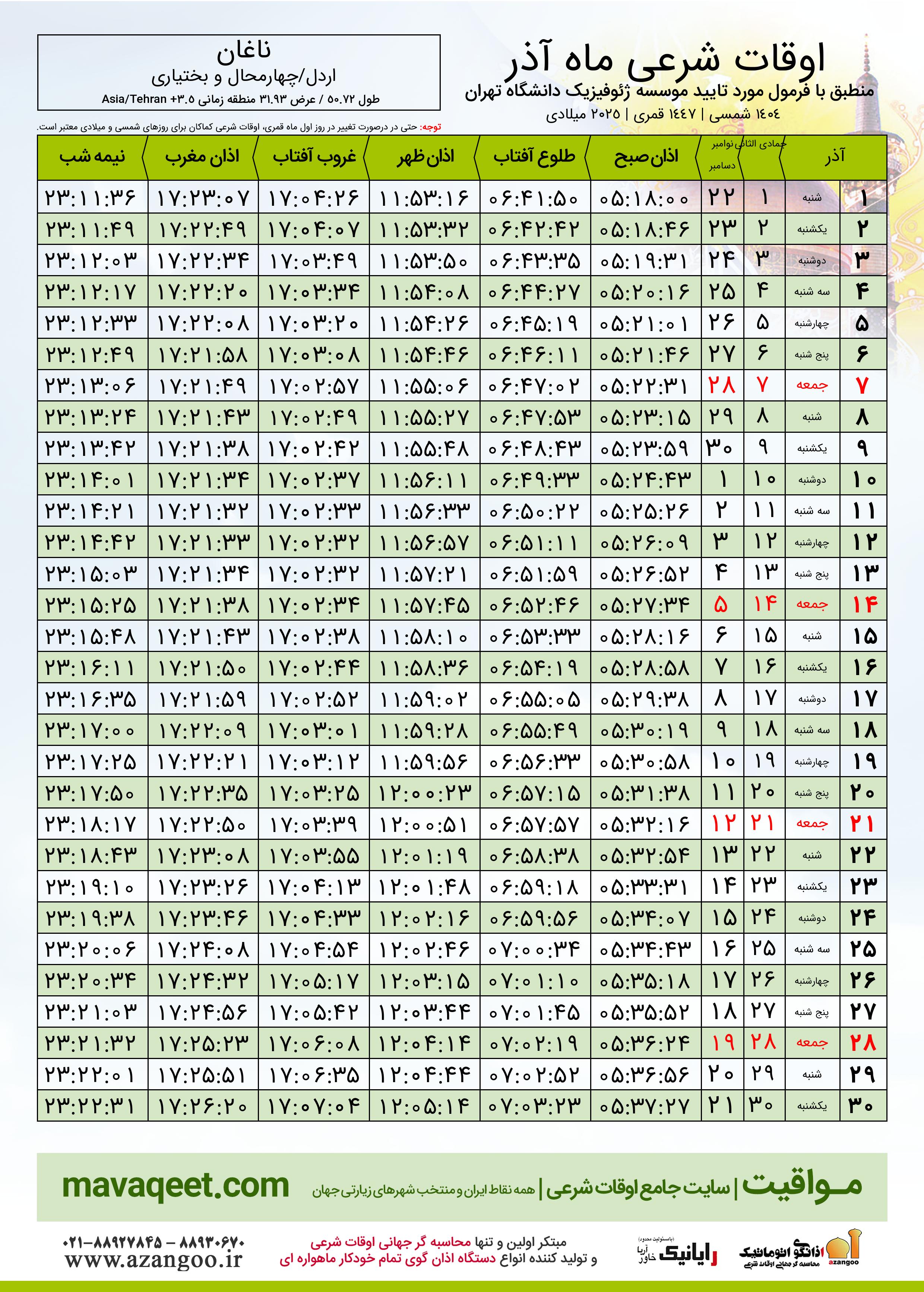 جدول اوقات شرعی آذر ١٤٠٤ شمسی شهر ناغان