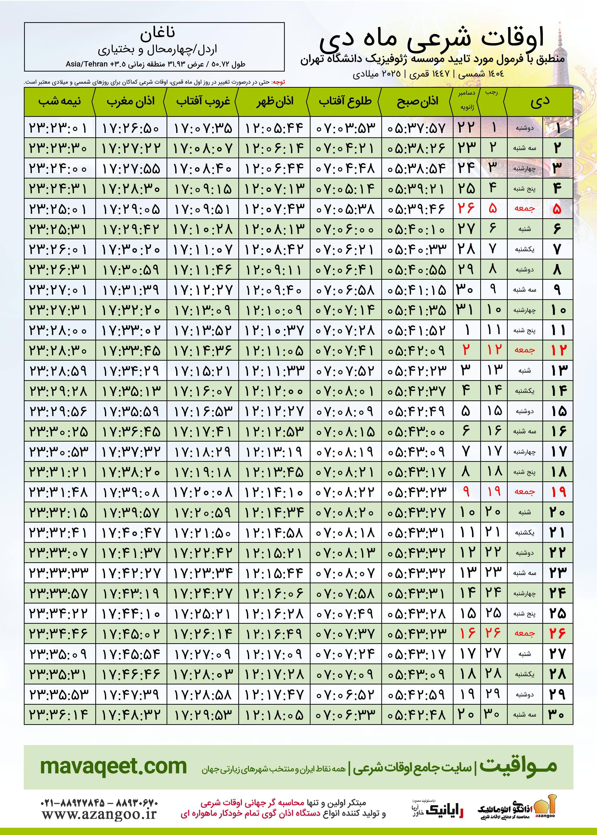 اوقات شرعی دی ١٤٠٤ شمسی شهر ناغان