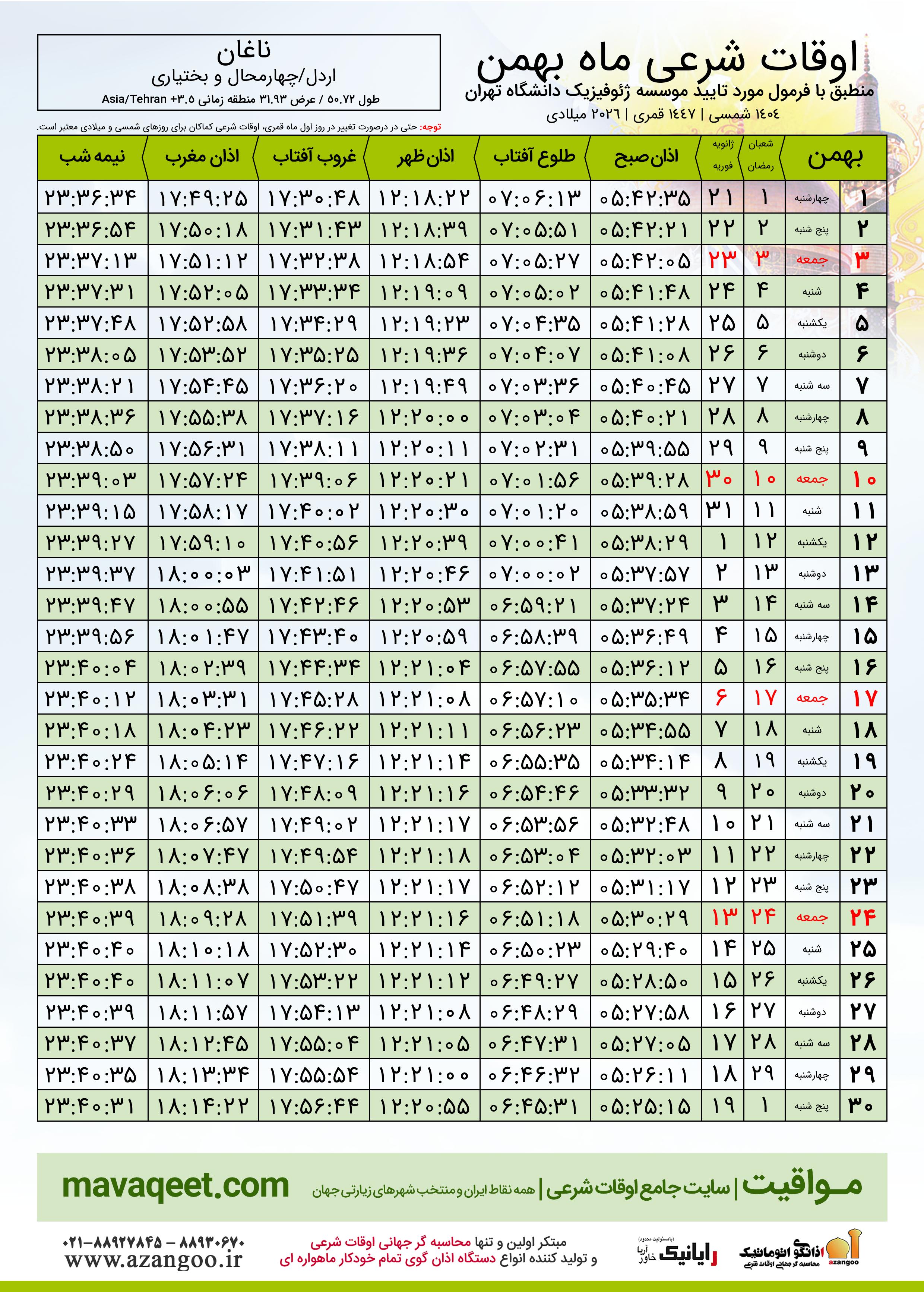 جدول اوقات شرعی بهمن ١٤٠٤ شمسی شهر ناغان
