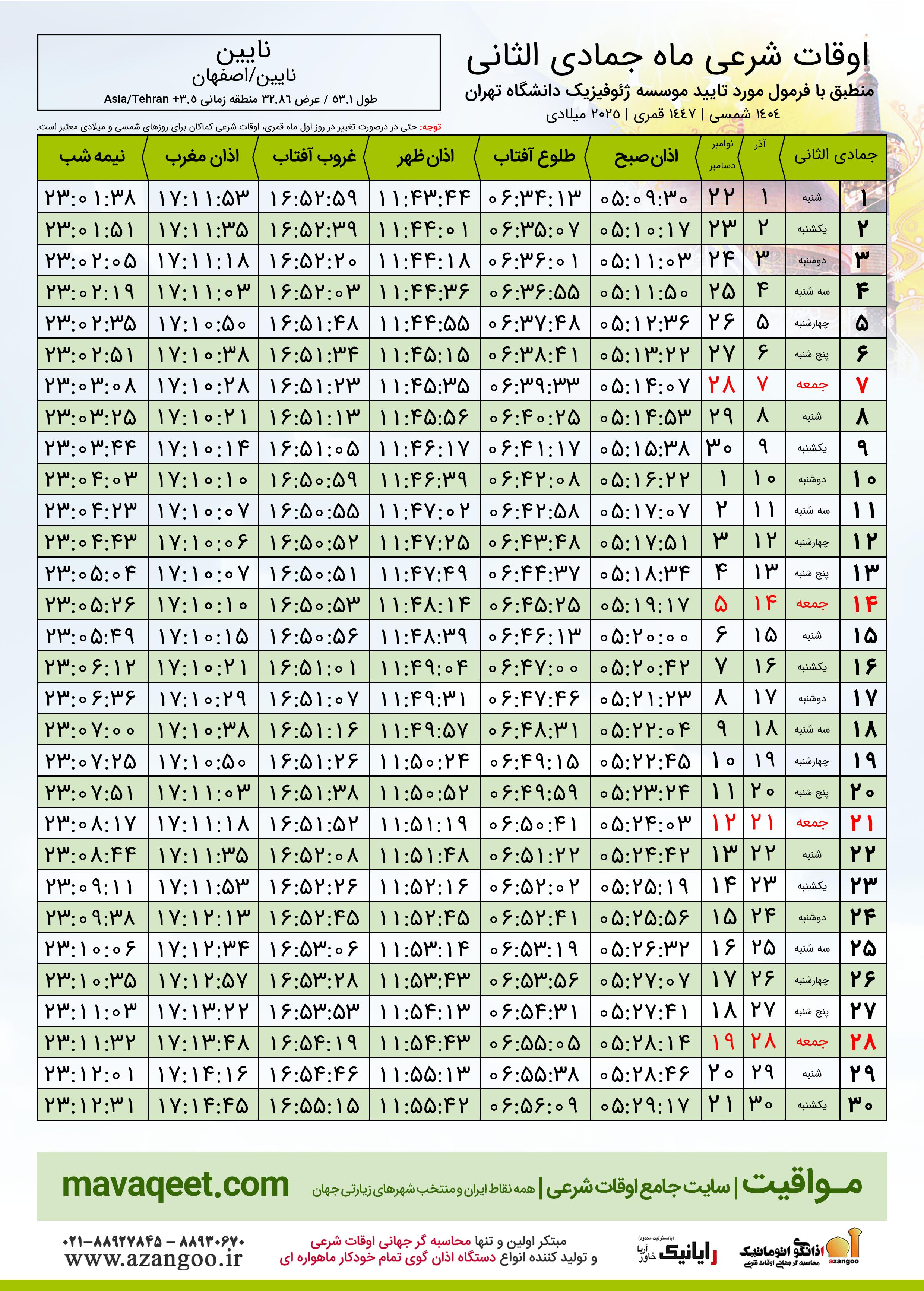 اوقات شرعی ماه جمادی الثانی ١٤٤٧ هـ.ق شهر نایین بر