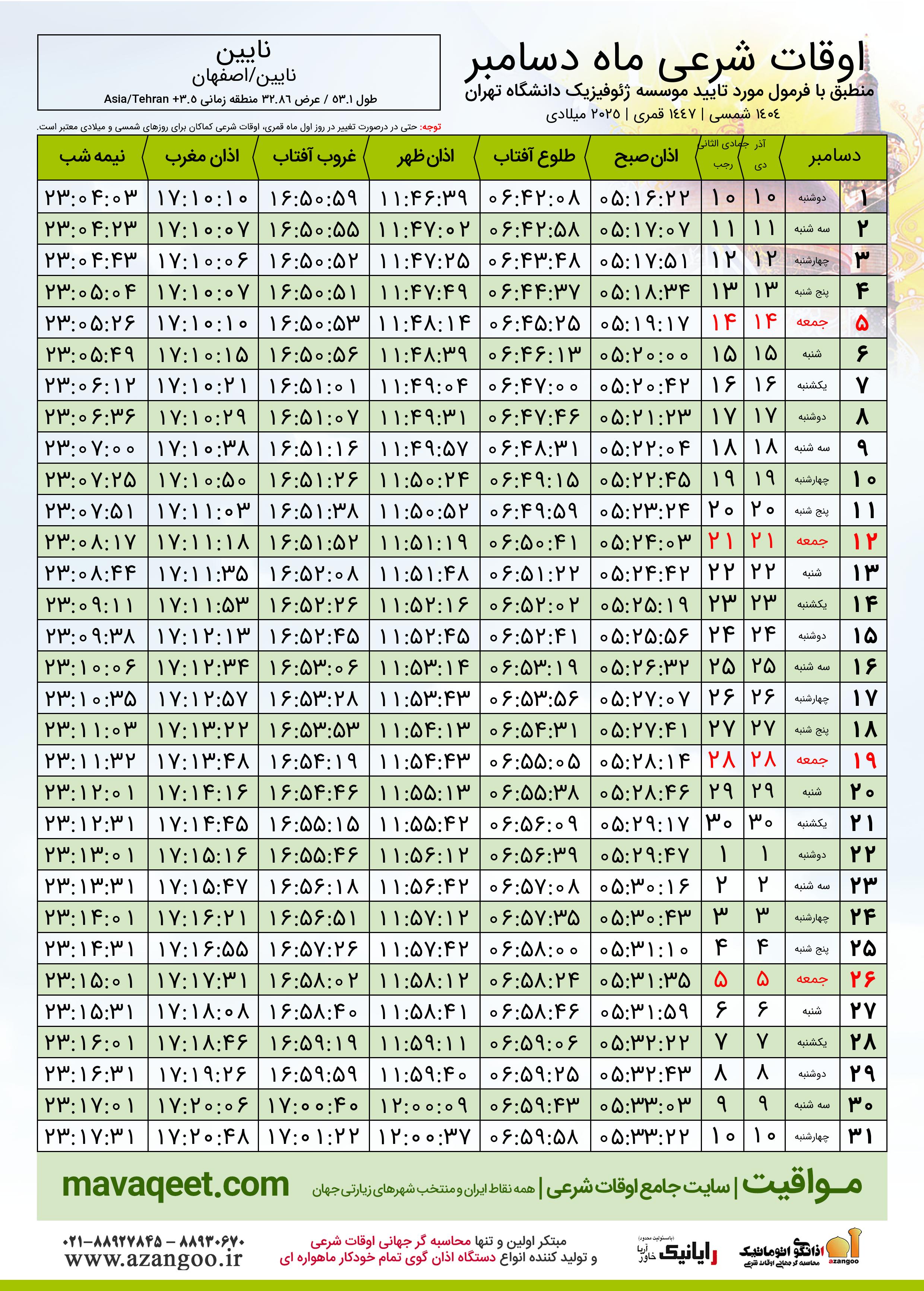 جدول اوقات شرعی دسامبر ٢٠٢٥ میلادی شهر نایین