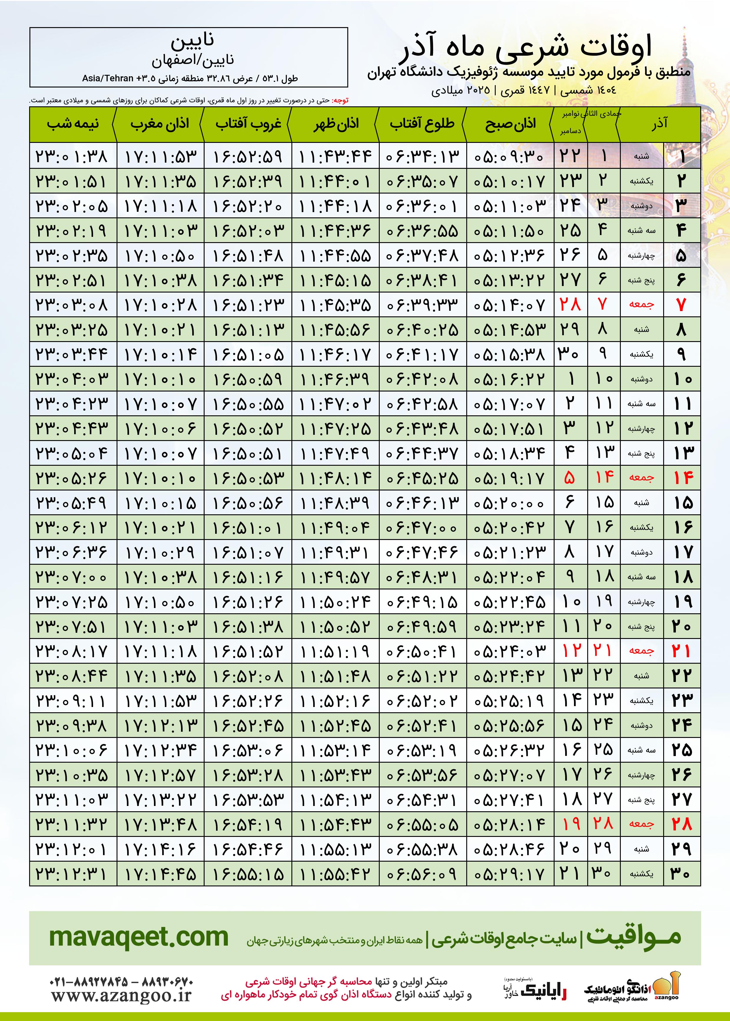 اوقات شرعی آذر ١٤٠٤ شمسی شهر نایین