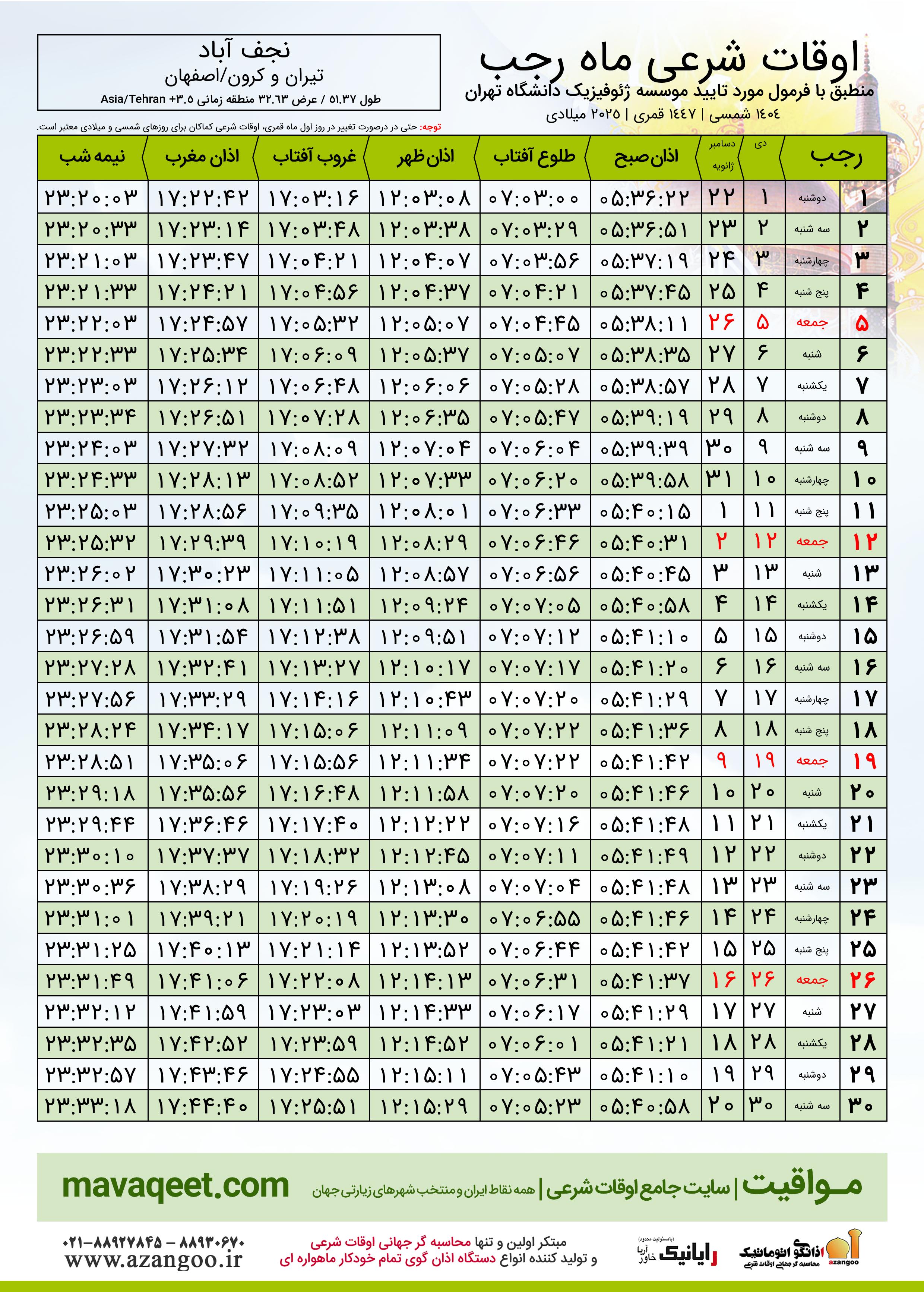 اوقات شرعی ماه رجب ١٤٤٧ هـ.ق شهر نجف آباد بر