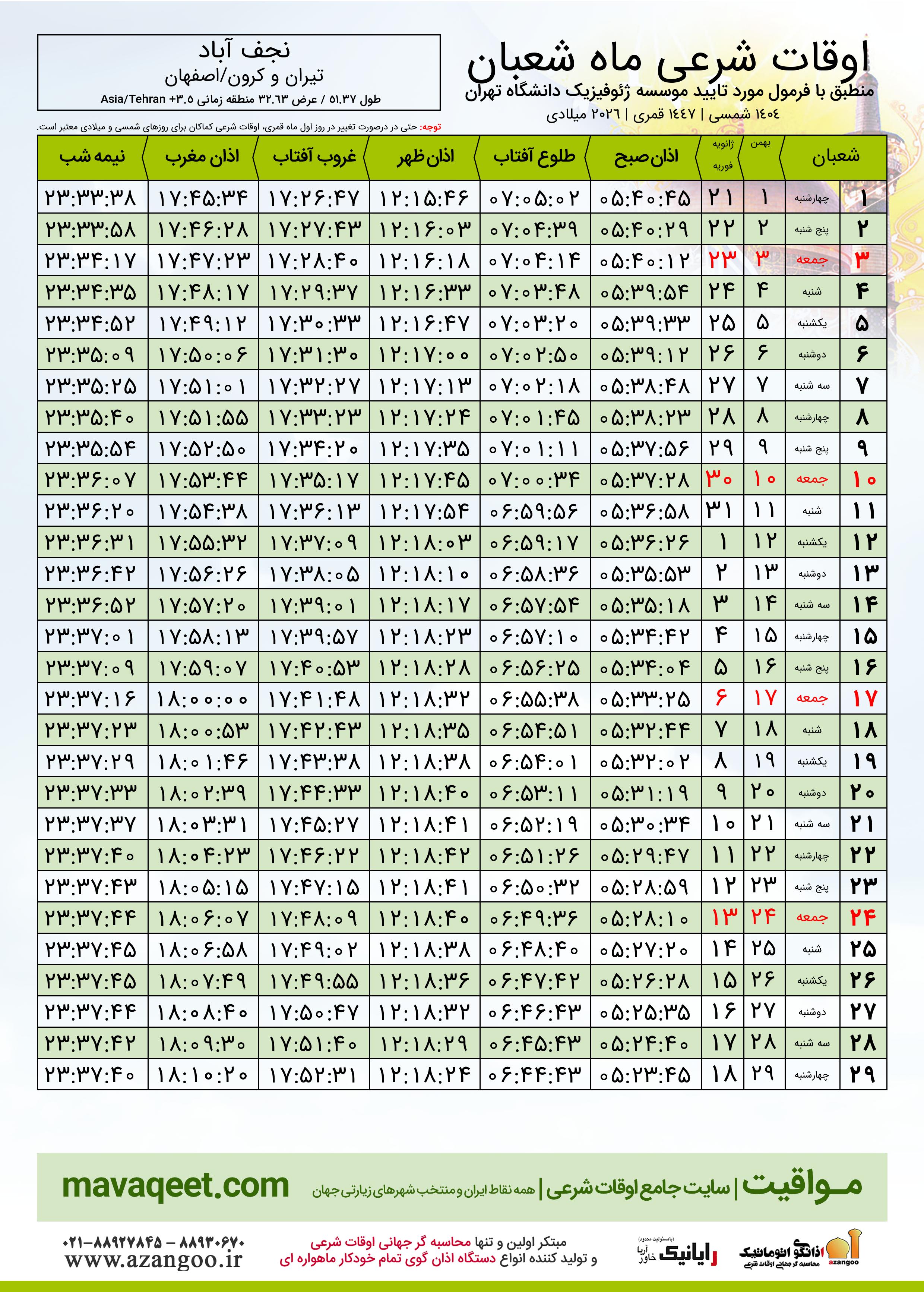 اوقات شرعی ماه شعبان ١٤٤٧ هـ.ق شهر نجف آباد بر