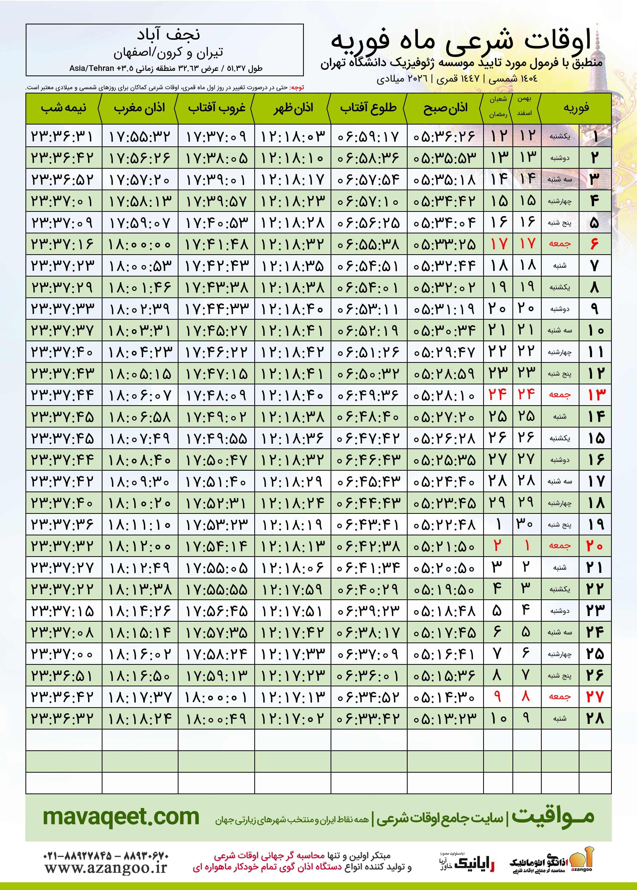 دانلود اوقات شرعی فوریه ٢٠٢٦ شهر نجف آباد
