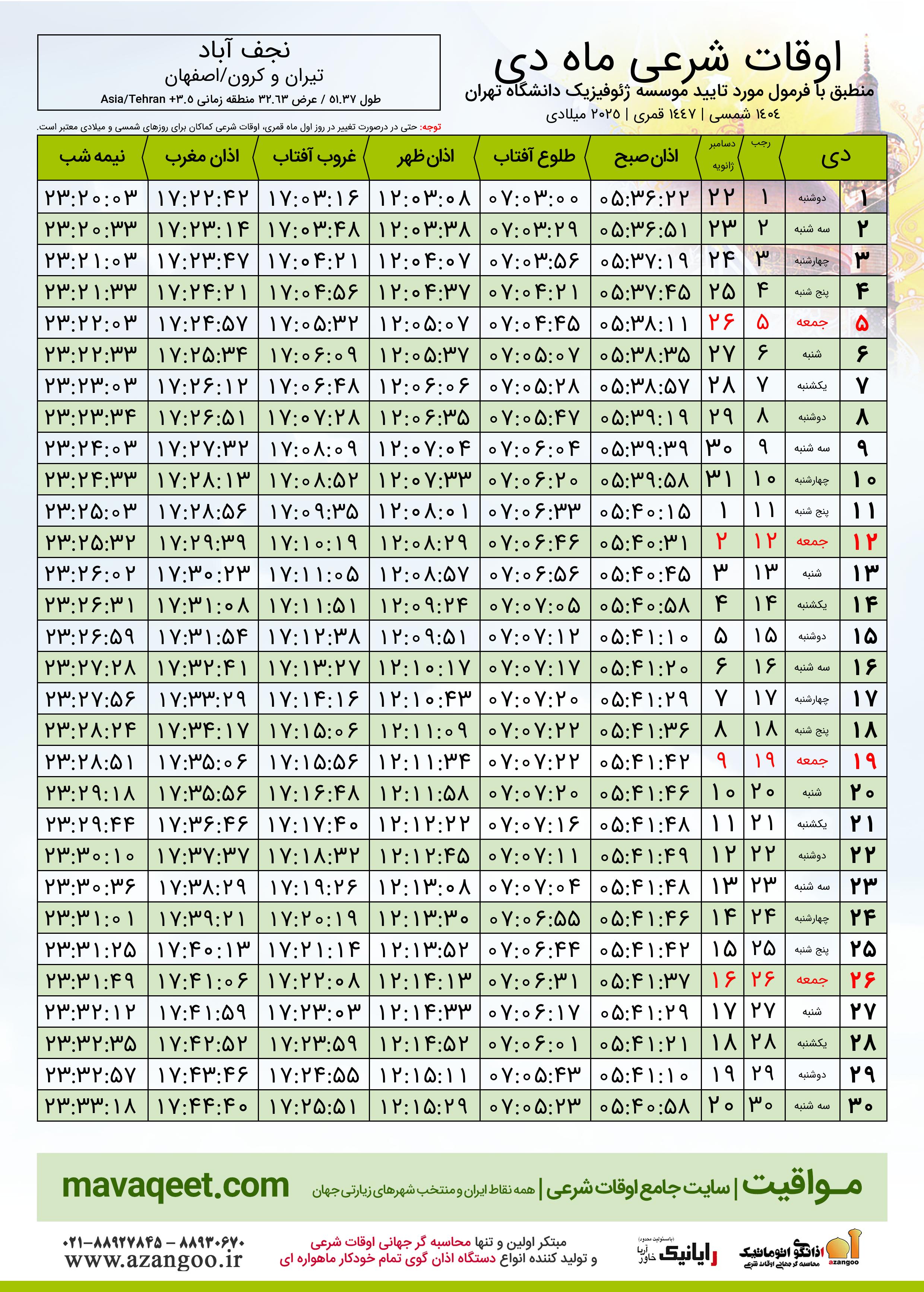 اوقات شرعی دی ١٤٠٤ شمسی شهر نجف آباد