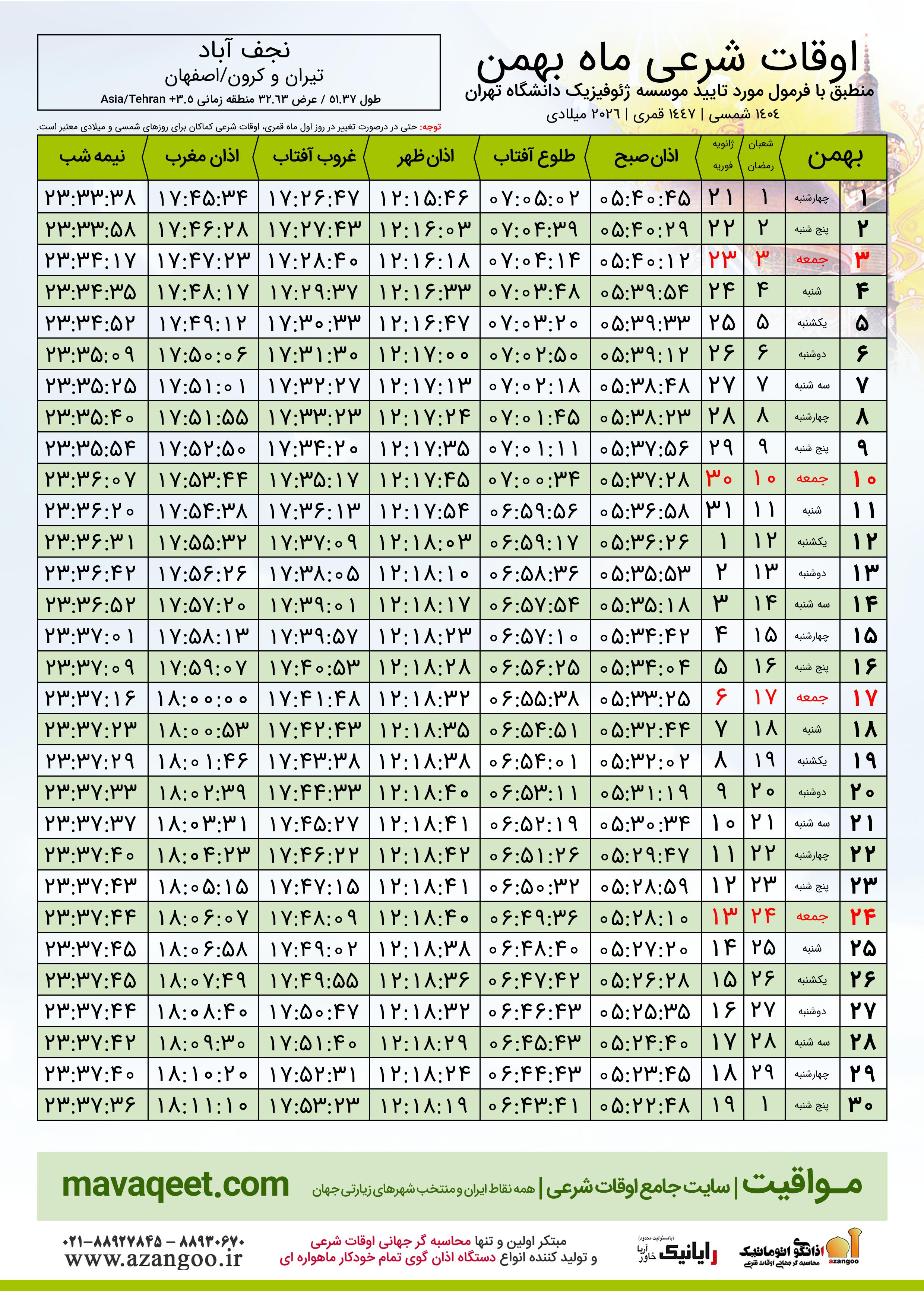 دانلود اوقات شرعی بهمن ٠٤ - ١٤٠٤ شهر نجف آباد