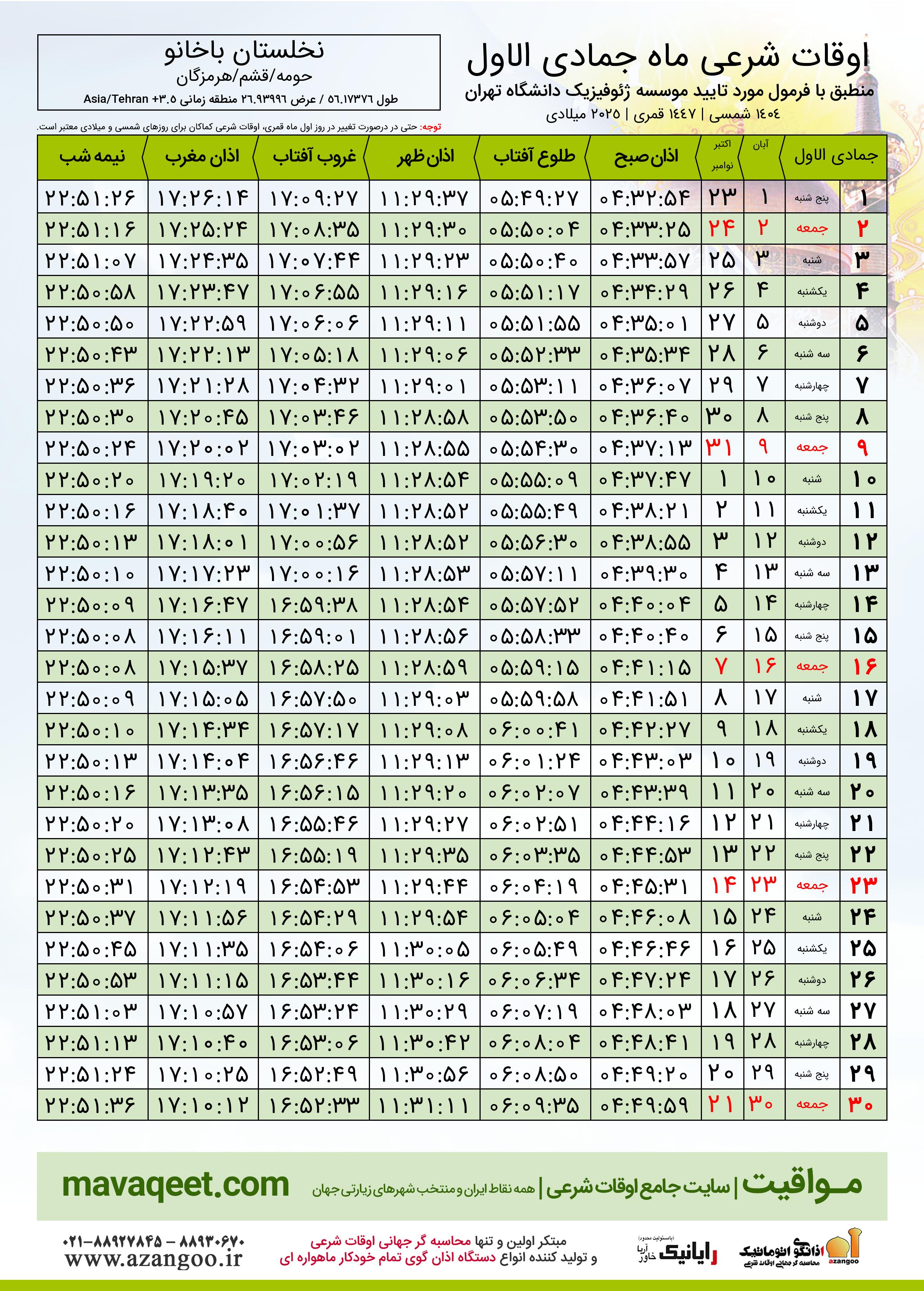 جدول اوقات شرعی جمادی الاول ١٤٤٧ قمری روستای نخلستان باخانو