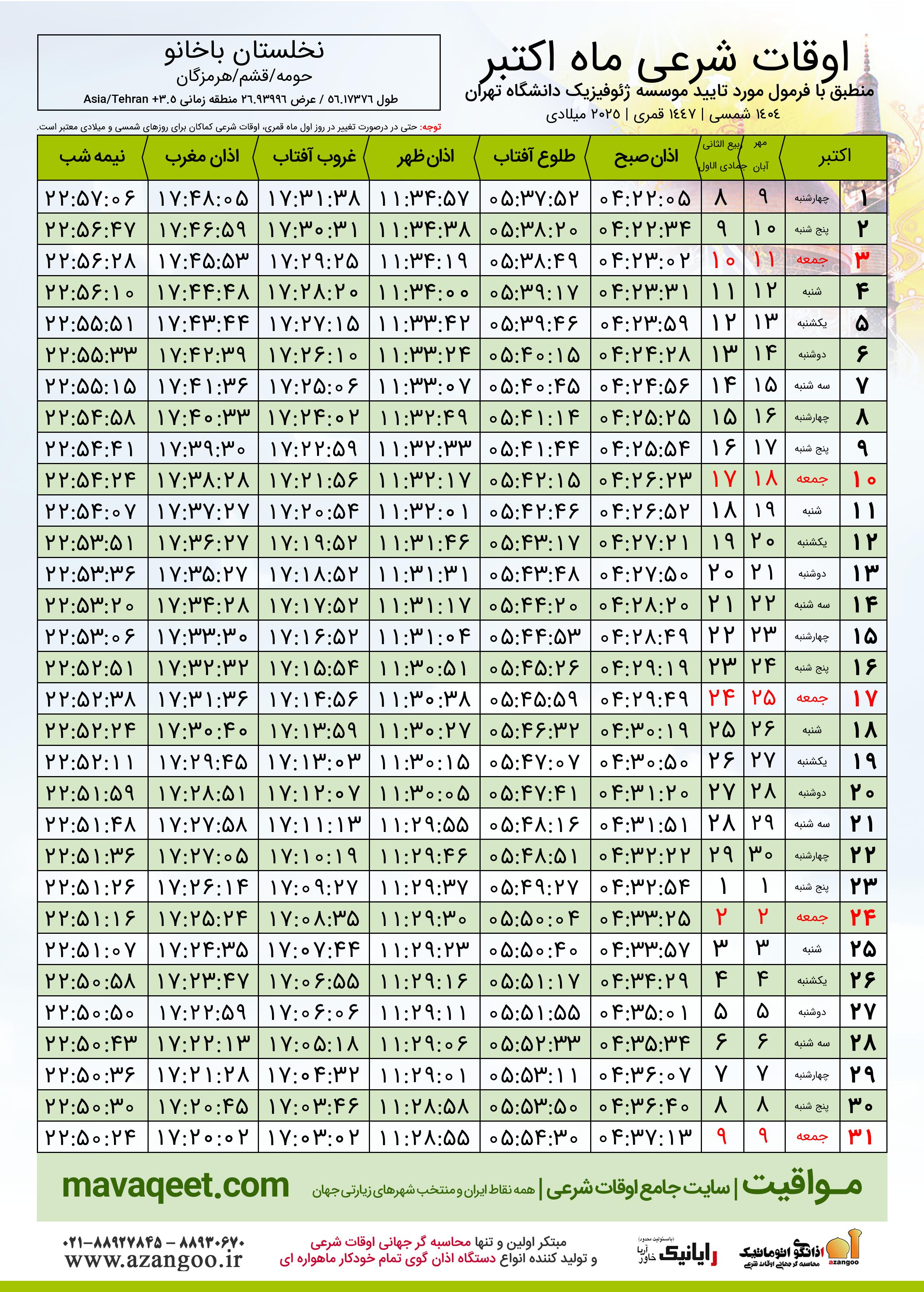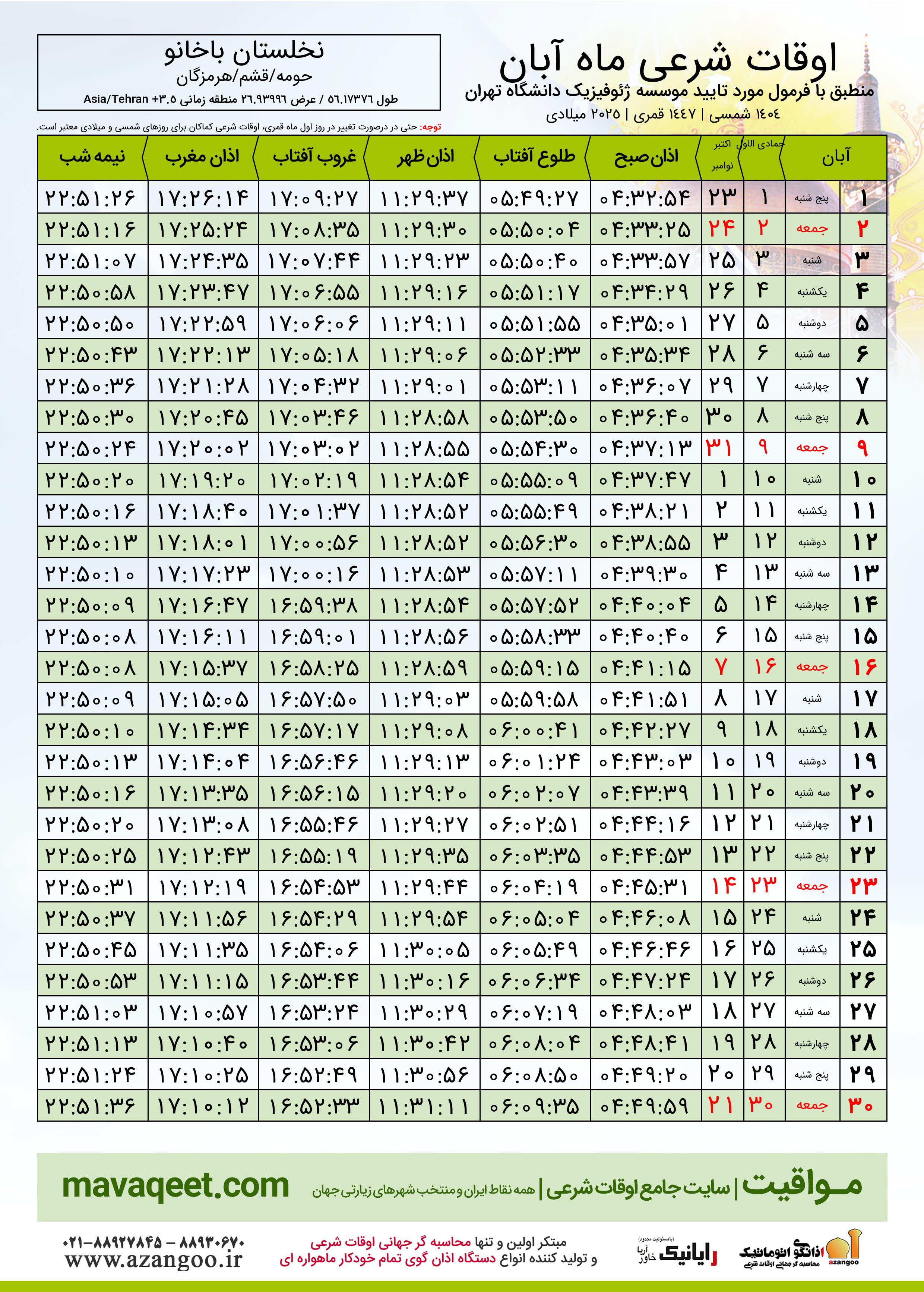 جدول اوقات شرعی آبان ١٤٠٤ شمسی روستای نخلستان باخانو