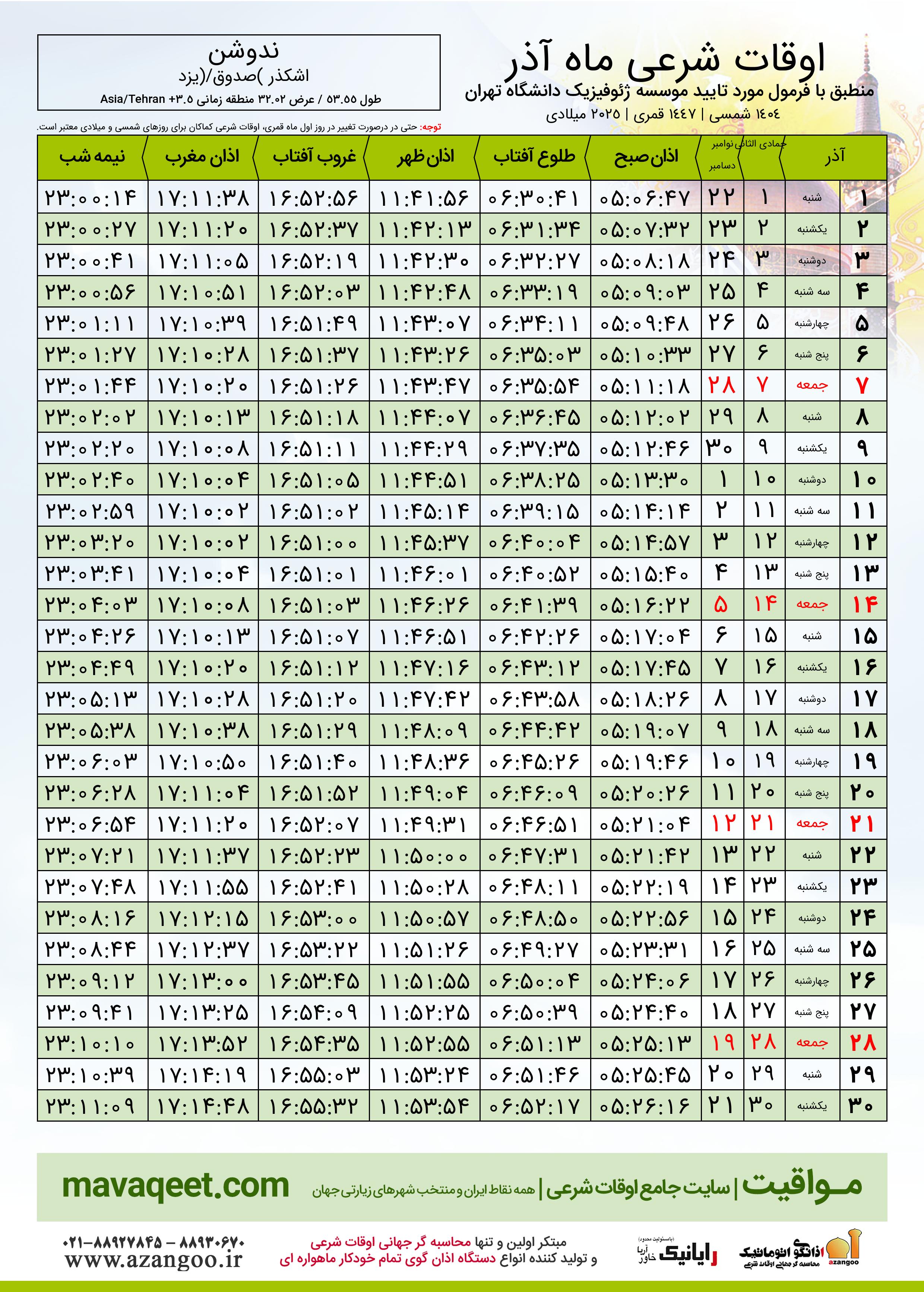 جدول اوقات شرعی آذر ١٤٠٤ شمسی شهر ندوشن