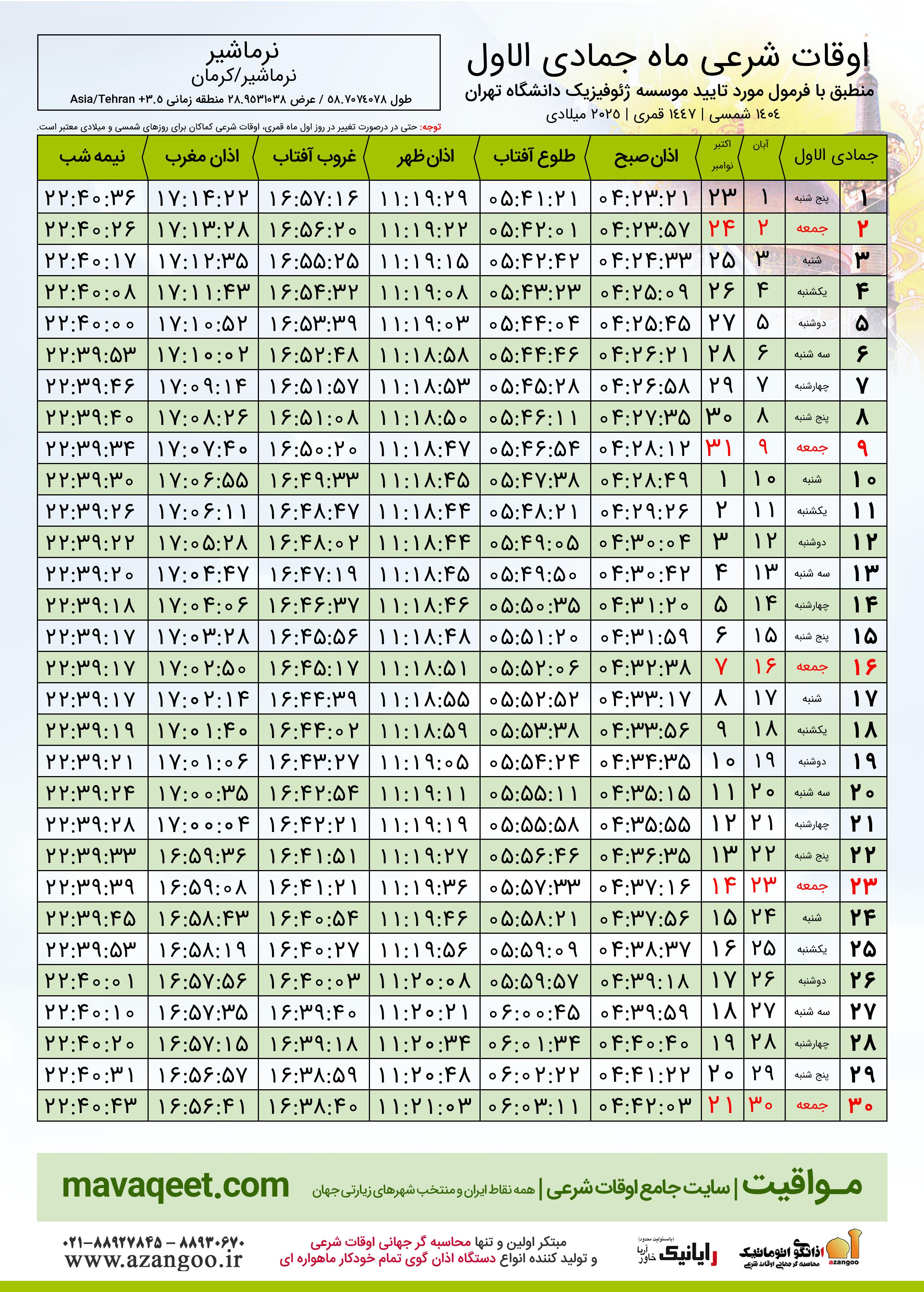 اوقات شرعی ماه جمادی الاول ١٤٤٧ هـ.ق شهر نرماشیر بر