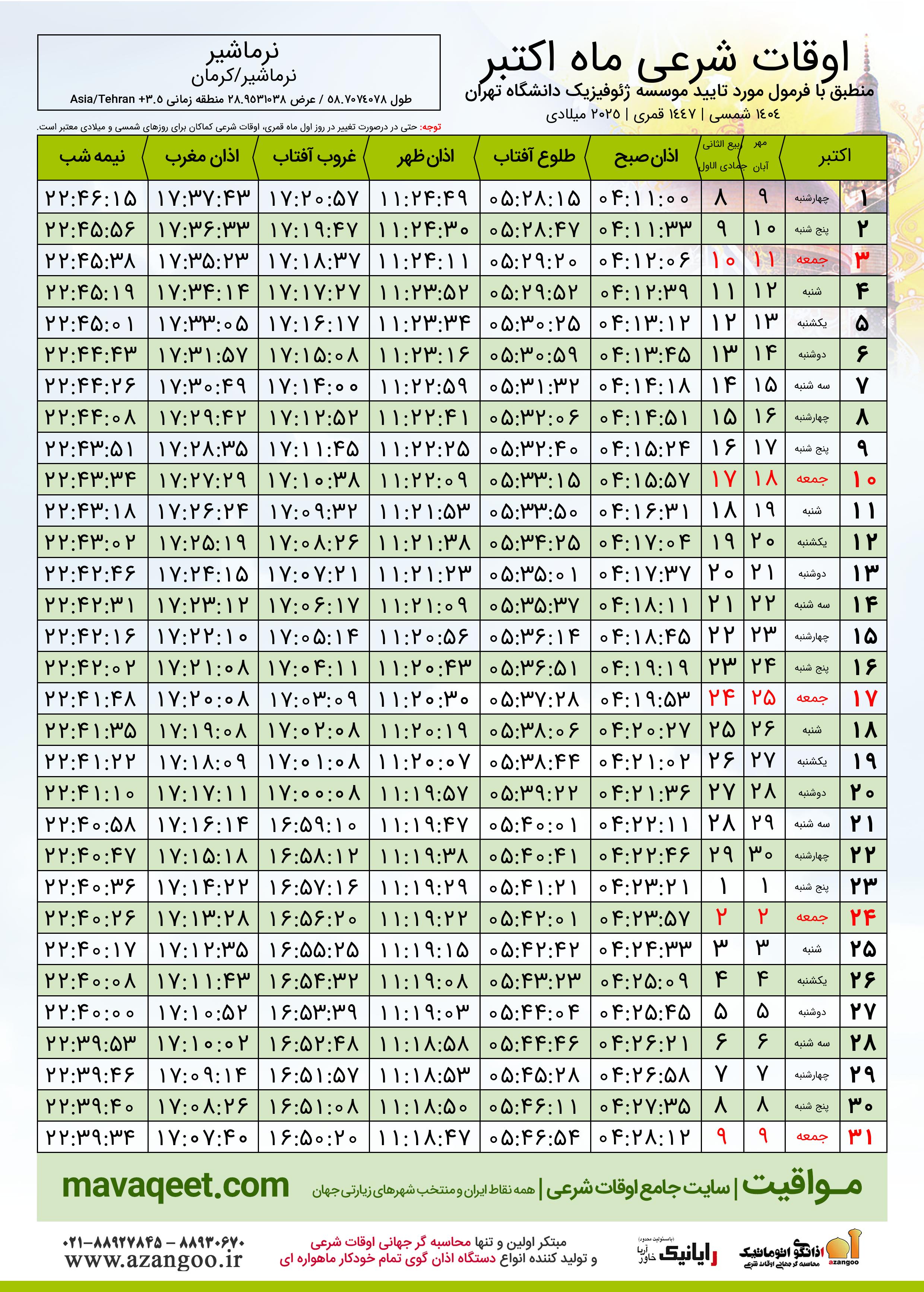 جدول اوقات شرعی اکتبر ٢٠٢٥ میلادی شهر نرماشیر