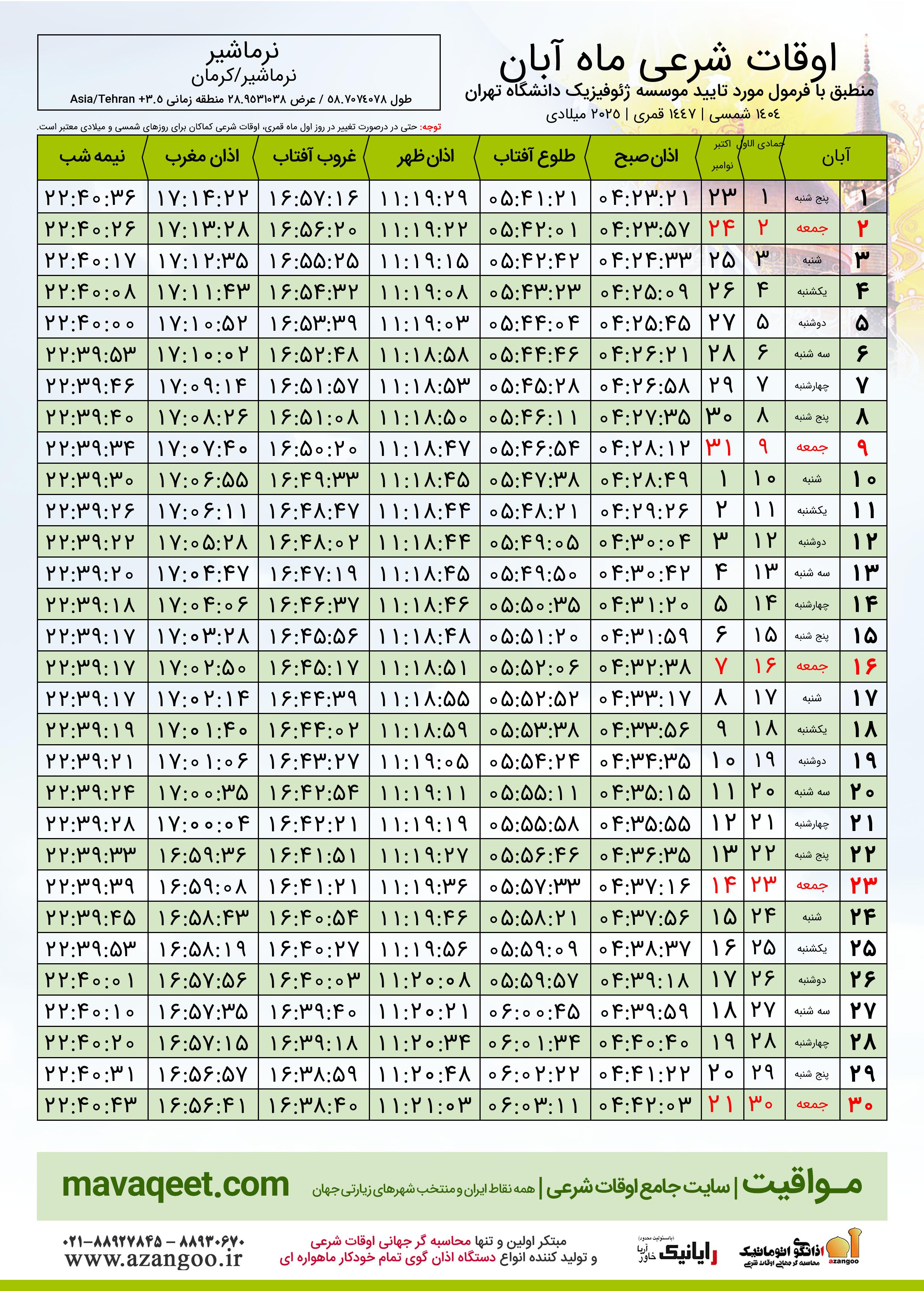 جدول اوقات شرعی آبان ١٤٠٤ شمسی شهر نرماشیر