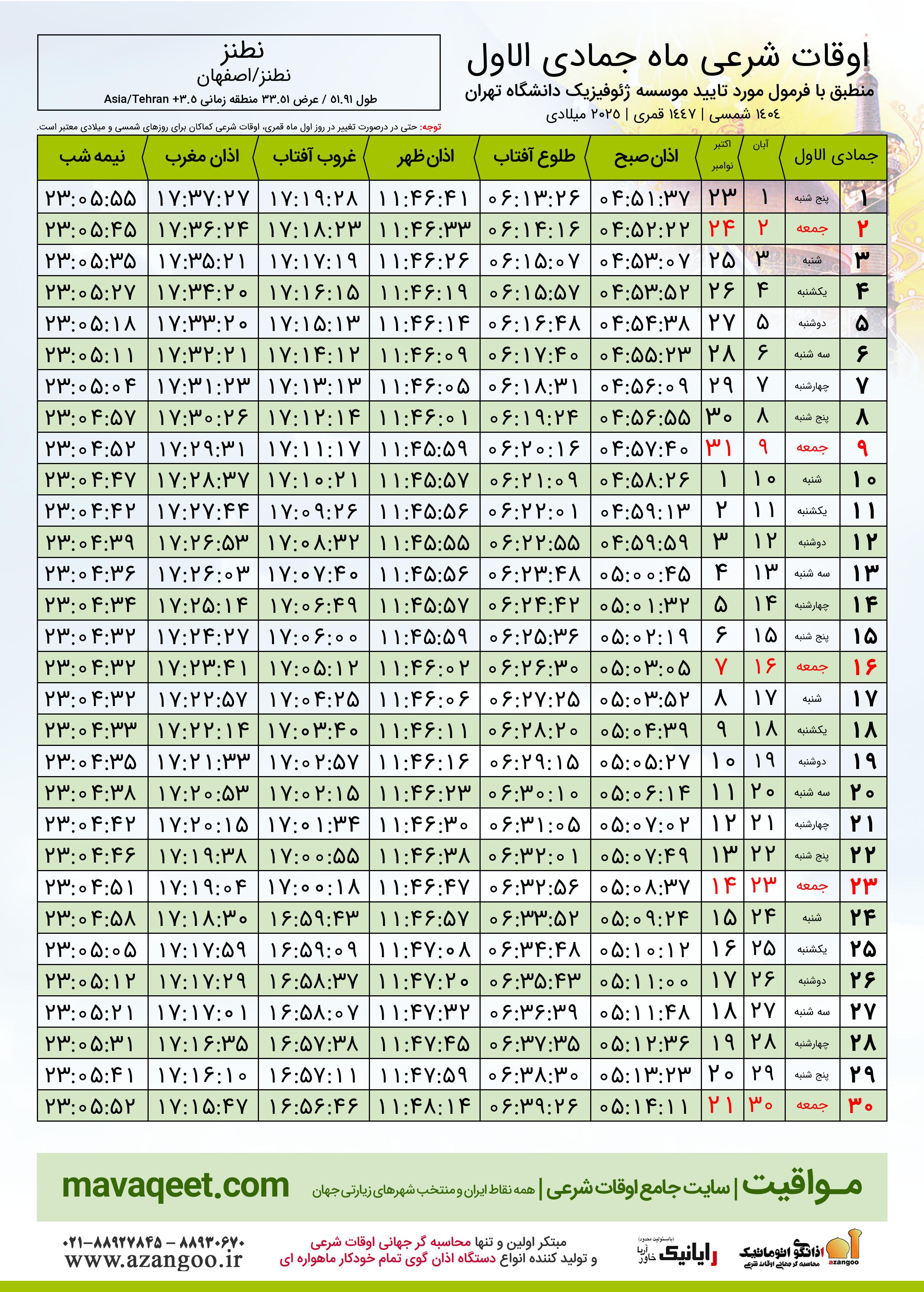 جدول اوقات شرعی جمادی الاول ١٤٤٧ قمری شهر نطنز