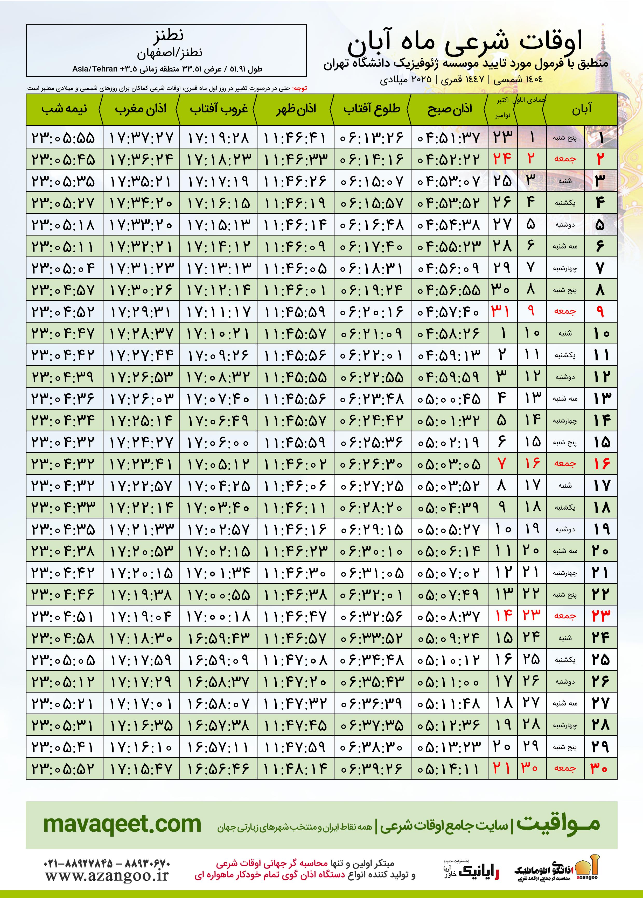 جدول اوقات شرعی آبان ١٤٠٤ شمسی شهر نطنز