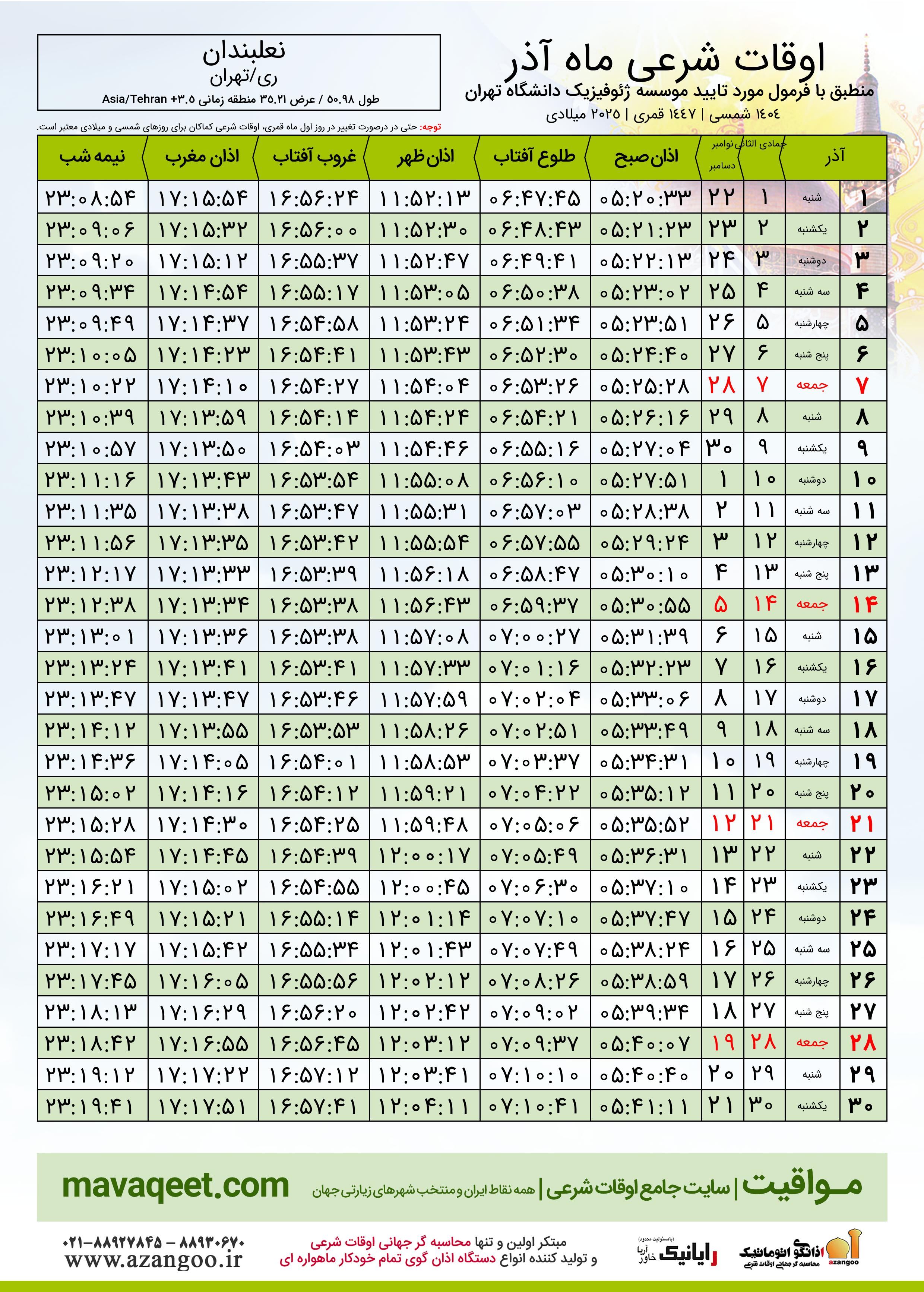 اوقات شرعی آذر ١٤٠٤ شمسی شهر نعلبندان