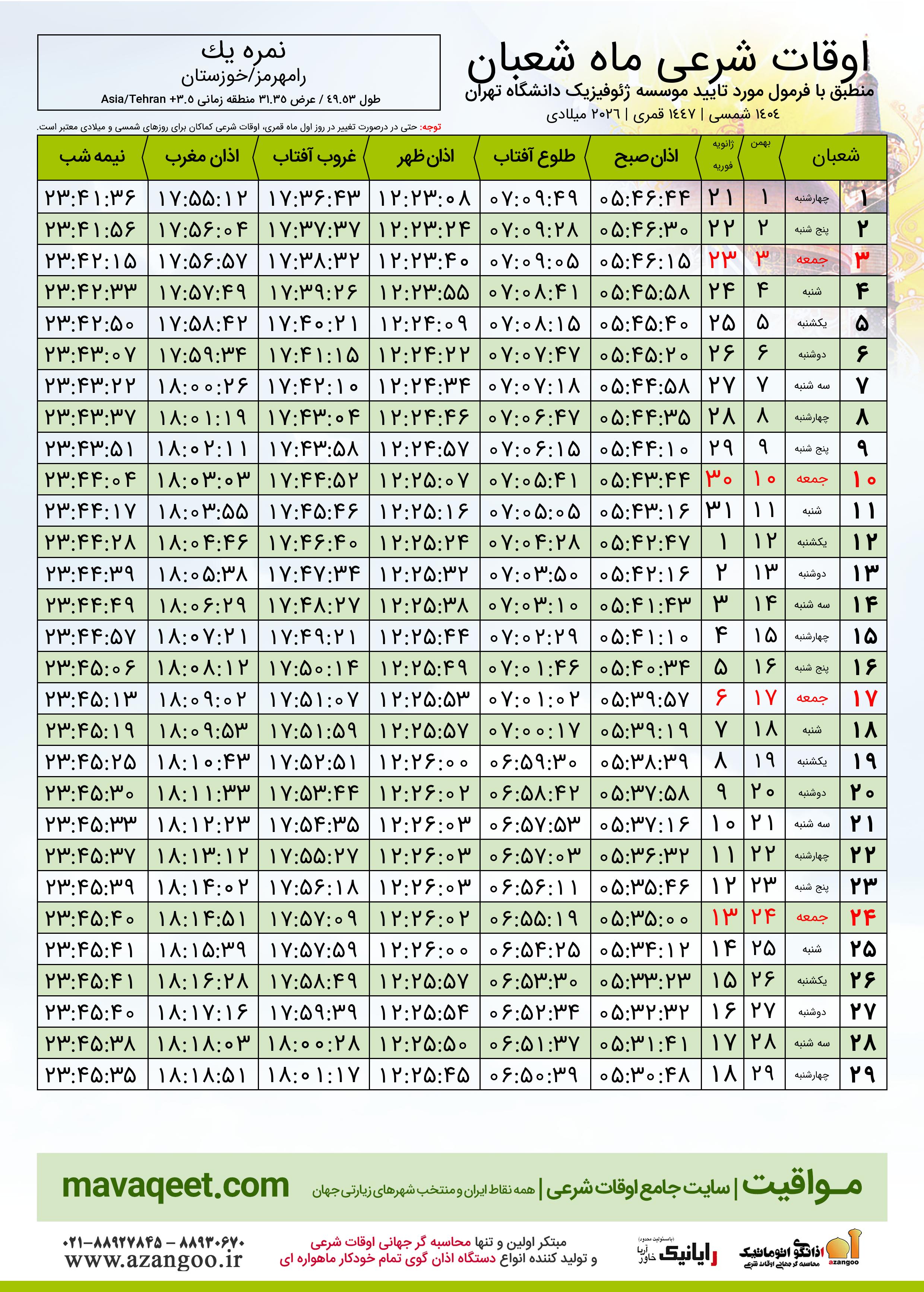 اوقات شرعی ماه شعبان ١٤٤٧ هـ.ق شهر نمره یک بر